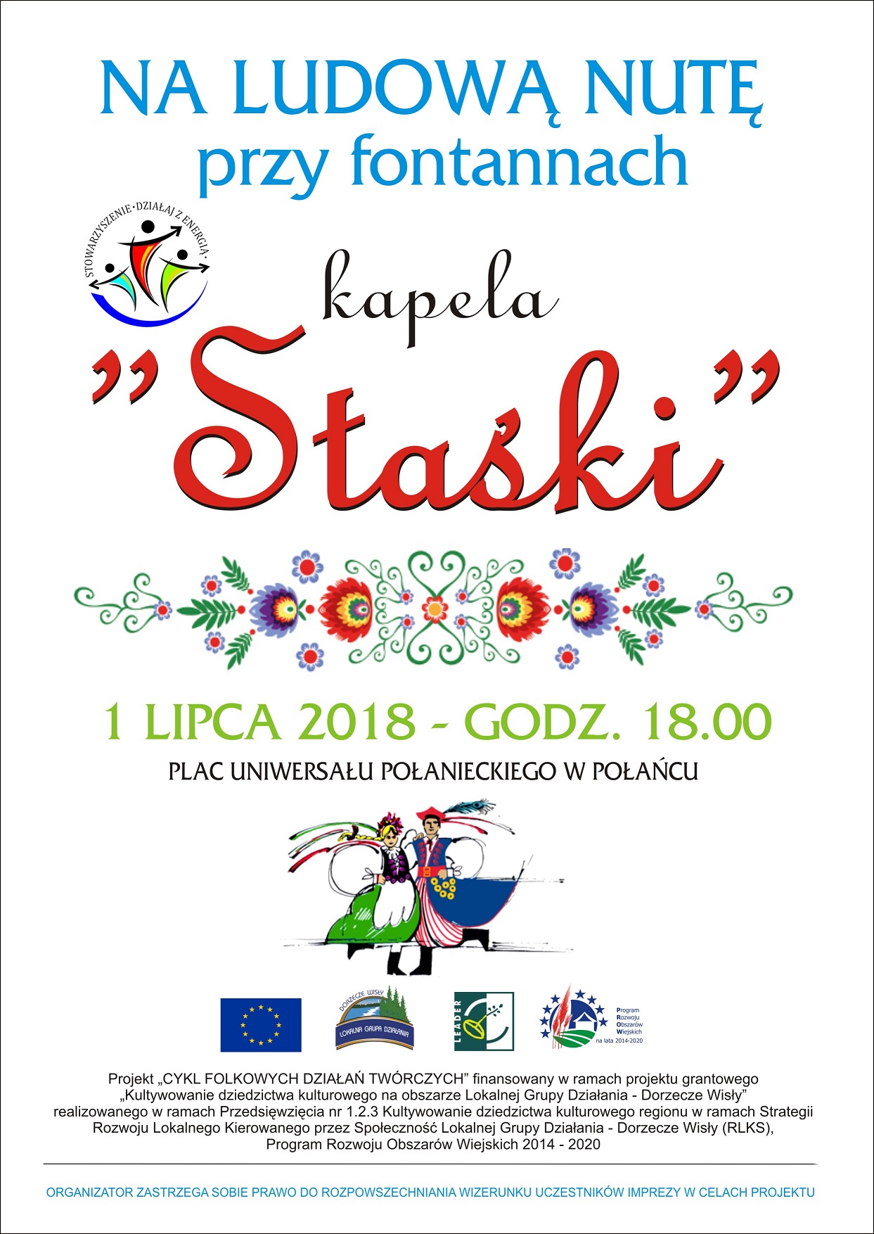 Projekt składa się z 13 aktywizujących działań kulturalno - artystycznych inspirowanych folkiem. Na pierwsze z serii działań zapraszamy już 1 lipca o godz. 18.00 na Pac Uniwersału Połanieckiego. „Na ludową nutę przy fontannach” zagra świętokrzyska Kapela „STAŚKI”.