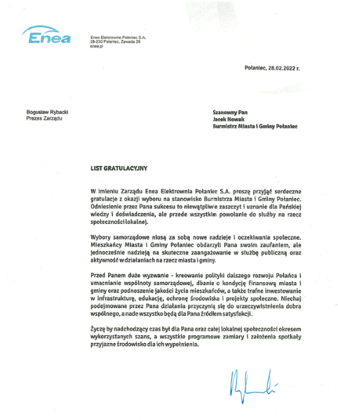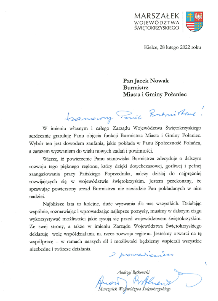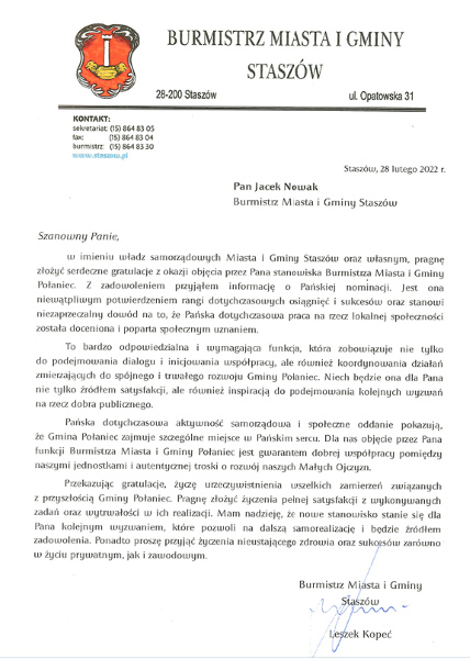 GRATULACJE DLA BURMISTRZA – PANA JACKA NOWAKA W ZWIĄZKU Z WYBOREM