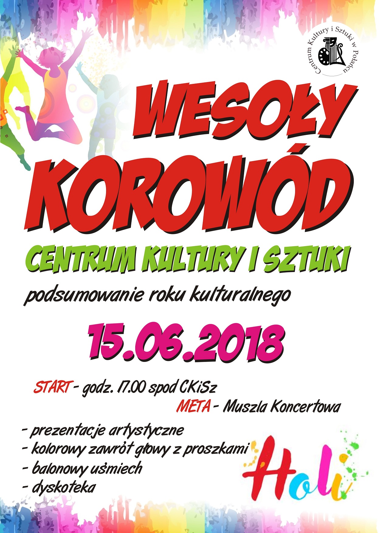 Zapraszamy do udziału w jedynym w swoim rodzaju, niepowtarzalnym WESOŁYM KOROWODZIE. W ten nietypowy sposób podsumujemy mijający rok kulturalny.Startujemy w piątek 15.06 o godz. 17.00 spod Centrum Kultury i Sztuki w Połańcu. Naszą metą będzie plac muszli koncertowej. Będzie głośno, będzie radośnie... kolorowo i wesoło.... zatem nikogo nie może zabraknąć!!