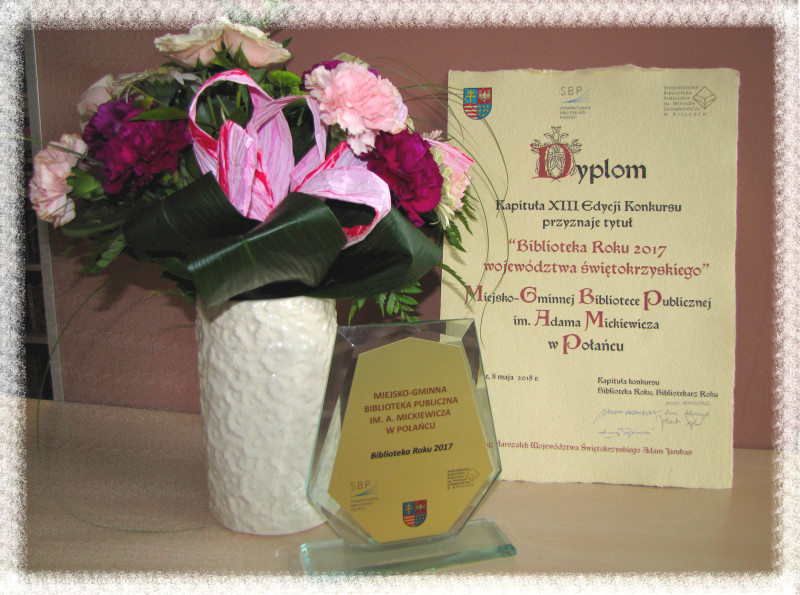 Biblioteka Roku Województwa Świętokrzyskiego oraz Świętokrzyski Bibliotekarz Roku, to konkursy które zostały zainicjowane trzynaście lat temu przez Zarząd Okręgu Stowarzyszenia Bibliotekarzy Polskich, Wojewódzką Bibliotekę Publiczną w Kielcach i samorząd województwa świętokrzyskiego w celu aktywizowania i promowania tych placówek, które kreatywnie działają na rzecz propagowania czytelnictwa.Oprócz naszej biblioteki do tytułu Biblioteki Roku nominowane zostały także Gminna Biblioteka Publiczna w Wodzisławiu oraz Miejska i Gminna Biblioteka Publiczna w Pińczowie. Kapituła konkursu postanowiła nagrodzić naszą placówkę za wszechstronną działalność. Dostrzeżono, że jesteśmy biblioteką nowoczesną, dobrze wyposażaną w zbiory, nie tylko w tradycyjnej książkowej formie, działającą w oparciu o nowe technologie. Doceniono nasze starania o aktywizację społeczeństwa lokalnego i organizację różnorodnych form pracy z czytelnikami w każdym wieku. To zaszczytne wyróżnienie jest dowodem uznania naszej codziennej pracy, a jednocześnie dopinguje do kolejnych, jeszcze skuteczniejszych działań na rzecz rozwoju biblioteki i promocji czytelnictwa w naszej gminie.