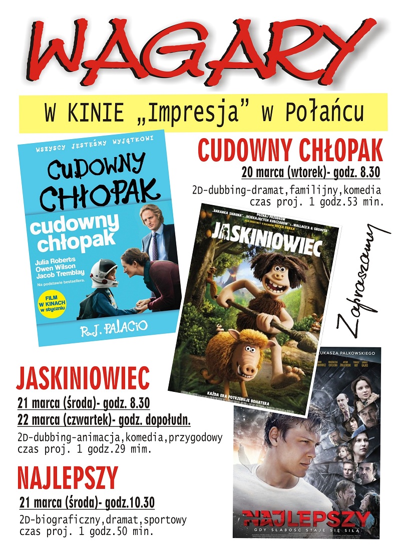 Zorganizowane grupy szkolne i przedszkolne zapraszamy do kina "Impresja" na filmowe Wagary. "Kinowe wagarowanie" zaczynamy od 20 marca (wtorku) filmem familijnym "Cudowny chłopak", a kończymy 22 marca (czwartek) bajką animowaną "Jaskiniowiec". Zapraszamy...