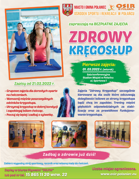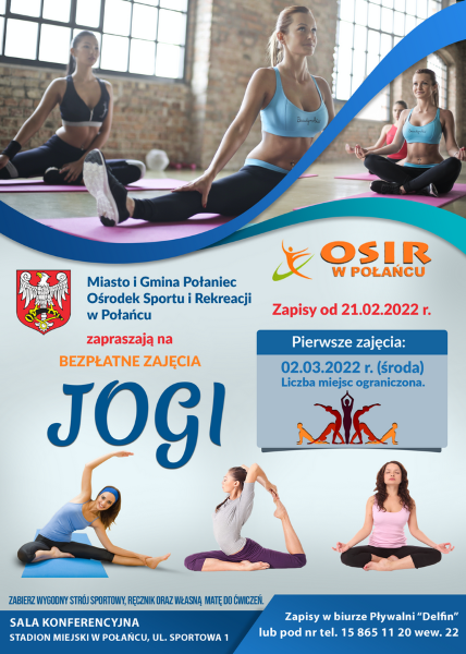 Ośrodek Sportu i Rekreacji w Połańcu ma przyjemność poinformować, iż ponownie ruszamy z zajęciami Jogi i Zdrowego Kręgosłupa. Zapisy ruszają 21.02.2022 (poniedziałek) od godz. 8.00 pod numerem telefonu 15 8651 120 wew. 22.