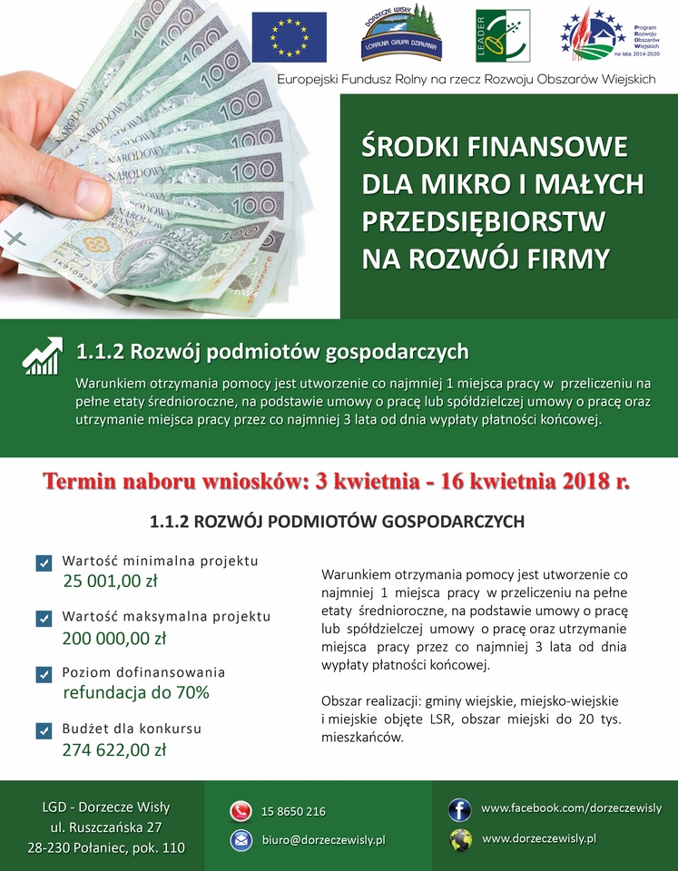 Lokalna Grupa Działania - Dorzecze Wisły ogłasza nabór wniosków o przyznanie pomocy w ramach poddziałania 19.2 „Wsparcie na wdrażanie operacji w ramach strategii rozwoju lokalnego kierowanego przez społeczność” objętego Programem Rozwoju Obszarów Wiejskich na lata 2014-2020 w ramach Przedsięwzięcia 1.1.2 Rozwój podmiotów gospodarczych. W ramach naboru finansowane będą operację, których celem będzie rozwój przedsiębiorczości poprzez rozwijanie działalności gospodarczej, a także rozwój przedsiębiorczości poprzez rozwijanie działalności gospodarczej i podnoszenie kompetencji osób realizujących operacje.