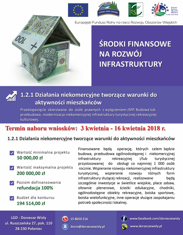 Lokalna Grupa Działania - Dorzecze Wisły ogłasza nabór wniosków o przyznanie pomocy w ramach poddziałania 19.2 „Wsparcie na wdrażanie operacji w ramach strategii rozwoju lokalnego kierowanego przez społeczność” objętego Programem Rozwoju Obszarów Wiejskich na lata 2014-2020 w ramach Przedsięwzięcia 1.2.1 Działania niekomercyjne tworzące warunki do aktywności mieszkańców. W ramach naboru finansowane będą operacje, których celem będzie budowa, przebudowa ogólnodostępnej i niekomercyjnej infrastruktury rekreacyjnej i/lub turystycznej przystosowanej do obsługi co najmniej 1 000 osób rocznie.