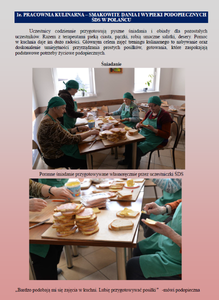 Zajęcia w pracowni kulinarnej prowadzone są codziennie. Ich głównym celem jest nauka samodzielnego przygotowania posiłku i czynności związanych z zaspokajaniem najważniejszych potrzeb życiowych. Zajęcia prowadzone są w bardzo dobrze wyposażonej kuchni, co pozwala na naukę obsługi sprzętów znajdujących się w pracowni. W pracowni kulinarnej podopieczni uczą się podstawowych czynności przydatnych w życiu codziennym takich jak samodzielnego przygotowywania posiłków. Utrwalają nabyte umiejętności kulinarne i wykorzystują je w codziennym życiu. Zajęcia kulinarne to również satysfakcjonująca droga rozwijania poczucia własnej wartości, kształtowania pozytywnych relacji. Uczestnictwo w zajęciach poprawia nastrój, uczy zaradności życiowej potrzebnej w codziennym funkcjonowaniu, rozwija cierpliwość, samodzielność i wytrwałość oraz umiejętności współdziałania, wyrabia poczucie estetyki i wyobraźni. Prowadzony z uczestnikami trening kształtuje cechy pożądane w relacjach społecznych takich jak współpraca, odpowiedzialność.Zajęcia w kuchni to także planowanie budżetu domowego, organizowanie przyjęć czy podejmowanie gości. Dziś prezentujemy zajęcia podopiecznych od tej strony.