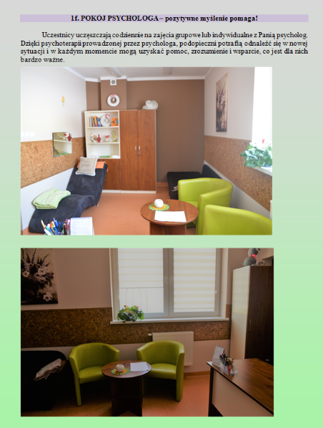 Zajęcia z psychologiem odbywają się, w zależności od potrzeby, indywidualnie lub grupowo. Zadaniem psychologa jest w pierwszej kolejności zbudowanie pozytywnego kontaktu terapeutycznego z podopiecznym oraz szeroko pojmowana diagnostyka mająca na celu poznanie indywidualnych możliwości, predyspozycji, zainteresowań podopiecznego oraz zakresu wymaganej pomocy czy wsparcia. Podczas spotkań z psychologiem uczestnicy zajęć uczą się poprawnego funkcjonowania w środowisku rodzinnym i społecznym – poprzez treningi umiejętności społecznych, interpersonalnych, komunikacyjnych, treningu rozwiązywania sytuacji trudnych i radzenia sobie ze stresem, rozwijaniu umiejętności z zakresu inteligencji, w tym inteligencji emocjonalnej. Podopieczni otrzymują wsparcie psychologiczne w sytuacjach trudnych, uczą się przeciwdziałać i rozwiązywać pozytywnie konflikty. Rozmowy z psychologiem dotyczą zarówno poważnych trudności życiowych, problemów codziennych, jak i zdarzeń i radości z życia każdego z podopiecznych. Podstawą każdej rozmowy jest dyskrecja i zaufanie.