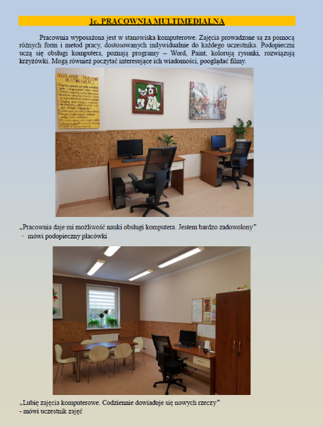A już dziś prezentujemy kolejną pracownię, jaką dysponuje Środowiskowy Dom Samopomocy w Połańcu - to pracownia multimedialna, w której zajęcia prowadzone są za pomocą różnych metod i form pracy dostosowanych indywidualnie do uczestników. Podopieczni uczą się praktycznej obsługi komputera, poznają system operacyjny i najważniejsze jego programy (np. edytor tekstu) oraz obsługa urządzeń peryferyjnych, ale oferta jest bardziej poszerzona.