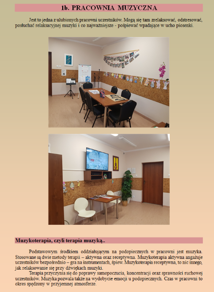 Dzisiaj prezentujemy kolejną pracownię w Środowiskowym Domu Samopomocy - pracownię muzyczną. To miejsce, w którym uczestnicy mogą wyzwolić swój potencjał twórczy, energię i cieszyć się muzyką na różne sposoby. Środkiem oddziaływania terapeutycznego w tej pracowni jest muzyka, która pobudza wyobraźnię i wpływa korzystnie na stan psychiczny. Muzyka ma zdolność wzbudzania emocji, ...
