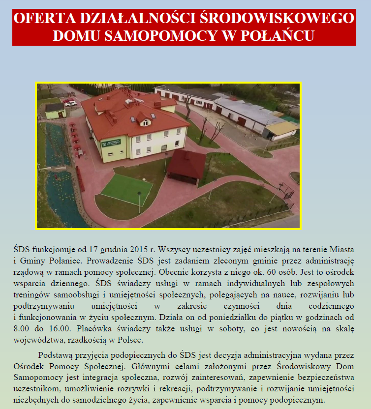 Nowocześnie, przyjaźnie, serdecznie – tak jest w Środowiskowym Domu Samopomocy w Połańcu. Pozbawiony barier architektonicznych stanowi gościnne i przyjazne miejsce, w którym można zadbać o własną rehabilitację społeczną i zawodową. Dzięki czynnemu udziałowi w zajęciach oferowanych przez nowo powstały Środowiskowy Dom Samopomocy, uczestnicy mają doskonałą alternatywę dla bezczynnego siedzenia w domu. Ponadto dzięki formie aktywności ogólny stan ulega polepszeniu lub co najmniej pozostaje na podobnym poziomie, zaś dzięki systematycznej rehabilitacji podopieczni odczuwają znaczną poprawę fizyczną, poprawia się ich komfort życia i czują mobilizację do nabywania kolejnych umiejętności. Kontakt z innymi uczestnikami zaspokaja potrzebę relacji interpersonalnych oraz poprawia stan psychiczny uczestników.