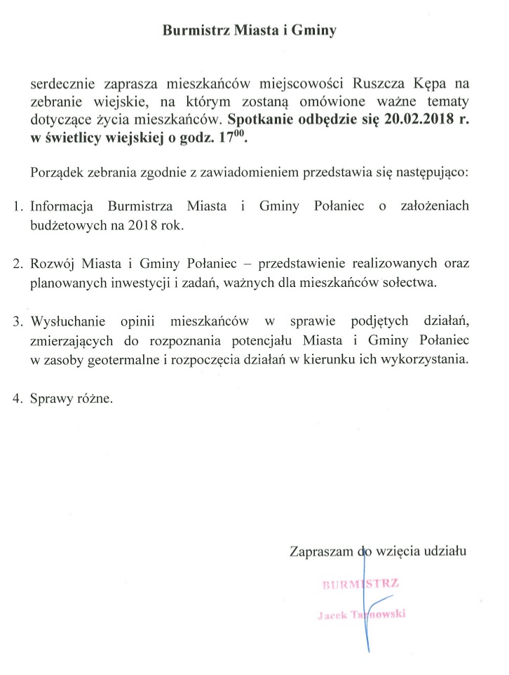 Informacja dla mieszkańców miejscowości: Ruszcza, Rybitwy, Przychody