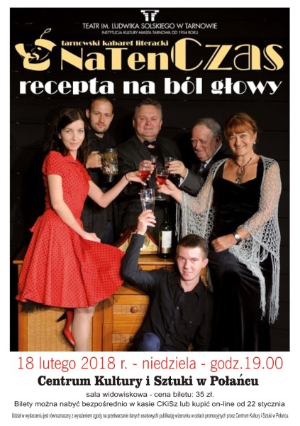 18 lutego (niedziela) o godz. 19.00 zapraszamy do Centrum Kultury i Sztuki w Połańcu na kolejne spotkanie z Tarnowskim Kabaretem Literackim "NaTenCzas" działającym w Teatrze im. Ludwika Solskiego w Tarnowie.