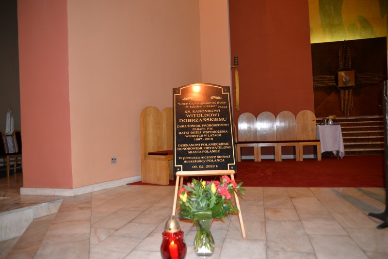 Wczoraj, 9 lutego, parafianie, duszpasterze w 1-ą rocznicę śmierci ks. Proboszcza - Witolda Dobrzańskiego uczcili Jego pamięć. Z tej właśnie okazji Ks. kan. mgr lic. Mariusz Piotrowski celebrował w kościele parafialnym pw. Matki Bożej Wspomożenia Wiernych Mszę Świętą, a po homilii poświęcił tablicę pamiątkową znajdującą się przy ołtarzu głównym ufundowaną przez mieszkańców.