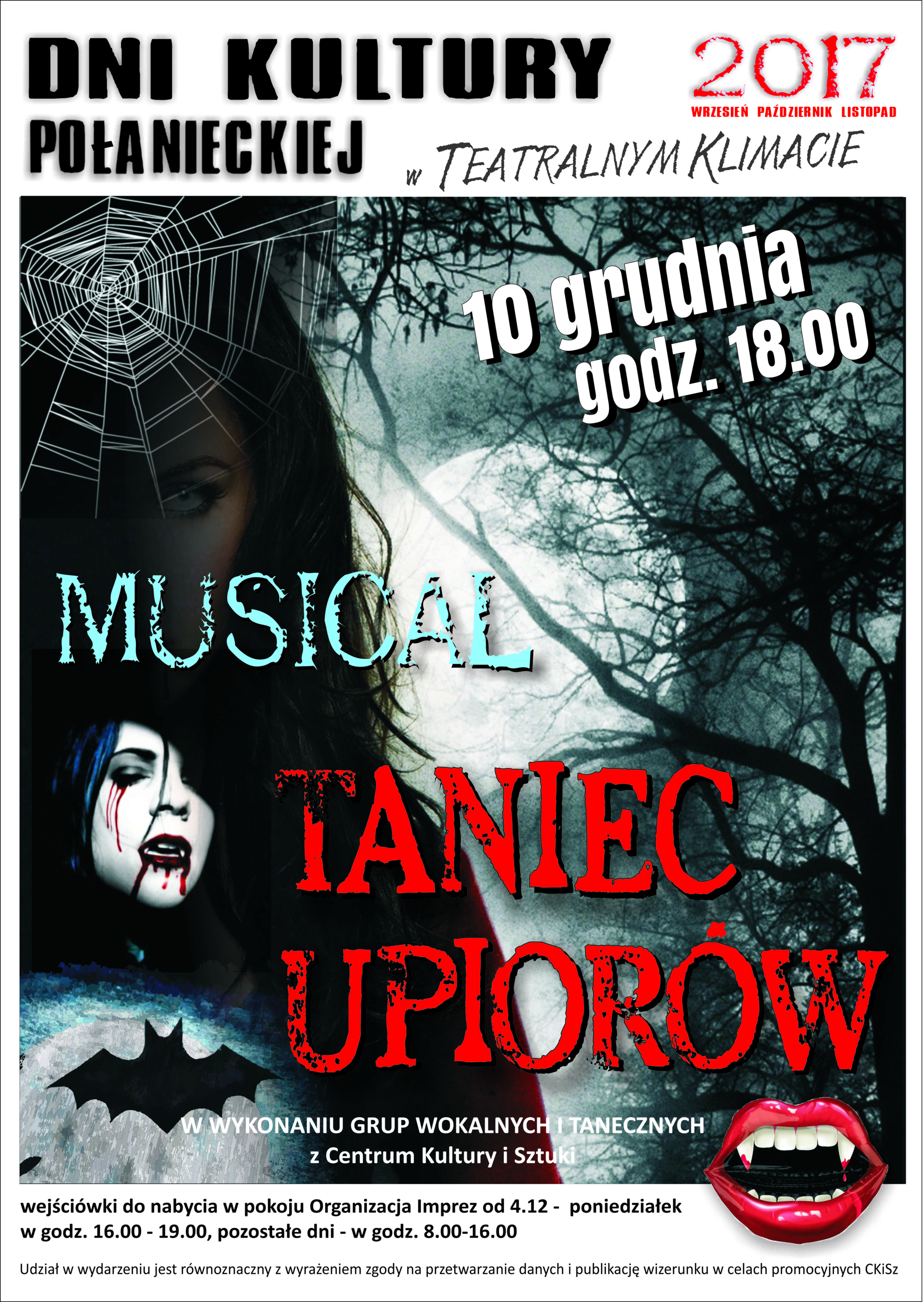 10 grudnia o godz. 18.00 po raz drugi zapraszamy do Centrum Kultury i Sztuki w Połańcu na niesamowity musical "Taniec Upiorów". Spektakl w całości został przygotowany i zrealizowany przez młodzież i instruktorów z CKiSz w ramach Dni Kultury Połanieckiej. Bogactwo dekoracji i kostiumów, demoniczna charakteryzacja, piękna muzyka w połączeniu z talentem aktorskim wykonawców to widowisko, które koniecznie trzeba zobaczyć ..... Zapraszamy serdecznie. Bezpłatne wejściówki do nabycia od poniedziałku 4 grudnia w pokoju Organizacja Imprez w Centrum Kultury i Sztuki.