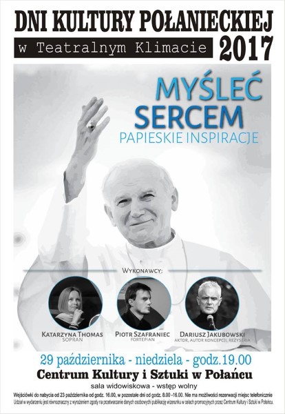 Przed nami kolejne działanie w ramach Dni Kultury Połanieckiej "W teatralnym klimacie". 29 października o godz. 19.00 zapraszamy na koncert "Myśleć sercem - Papieskie inspiracje" w wykonaniu Dariusza Jakubowskiego, Katarzyny Thomas i Piotra Szafrańca. Wstęp wolny