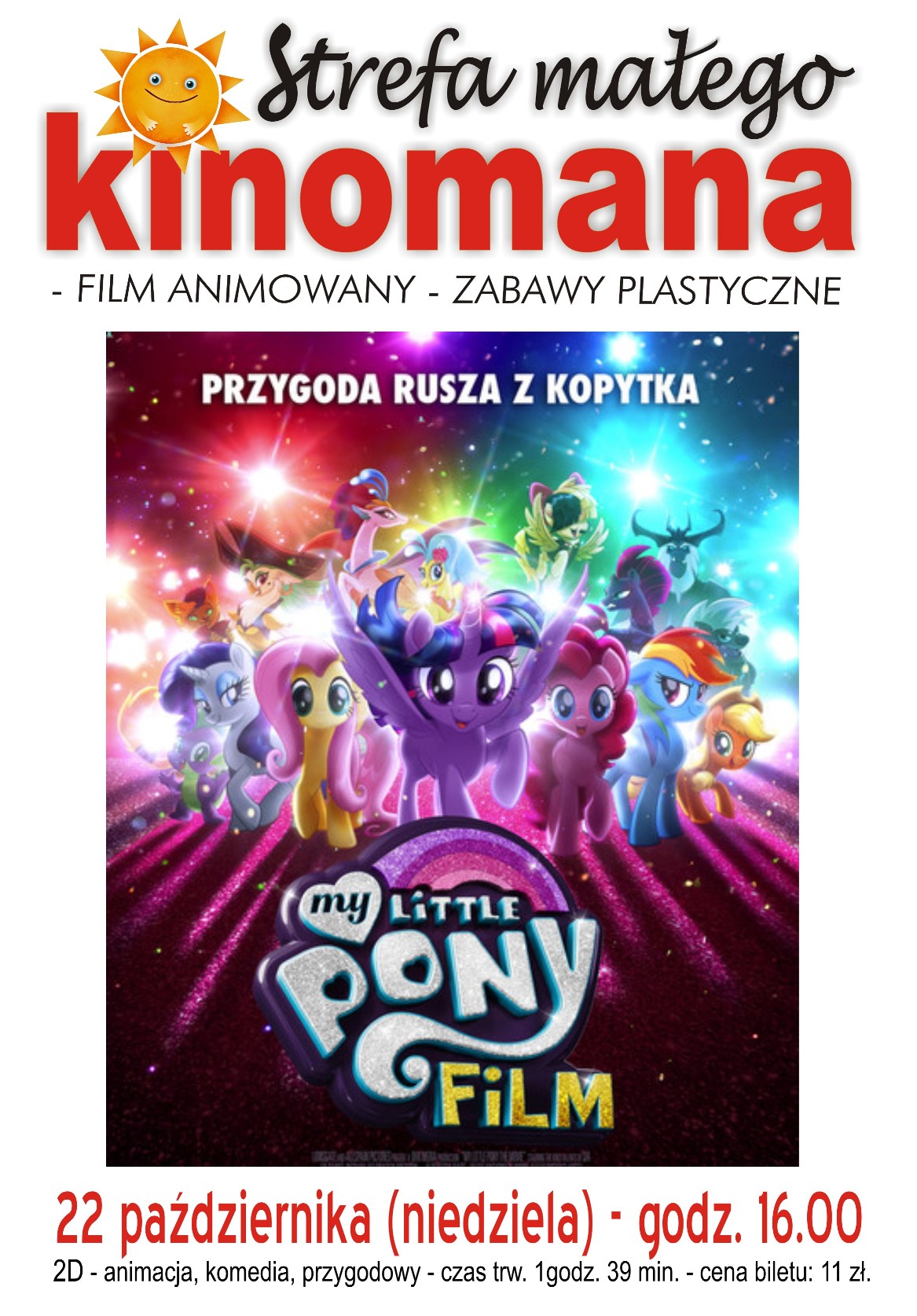 Zapraszamy na pierwsze po przerwie wakacyjnej spotkanie w Strefie Małego Kinomana. W najbliższą niedzielę 22 października o godz. 16:00 animowana bajka "My Little Ponny". Po bajce warsztaty plastyczne dla najmłodszych w cenie biletu 11 zł.