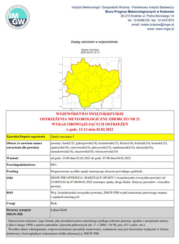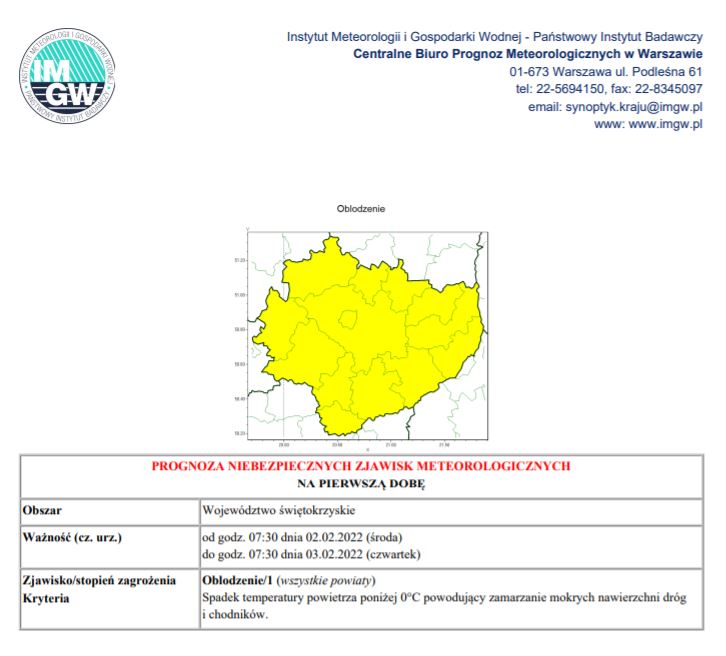 Prognoza niebezpiecznych zjawisk, oblodzenie - woj. świętokrzyskie