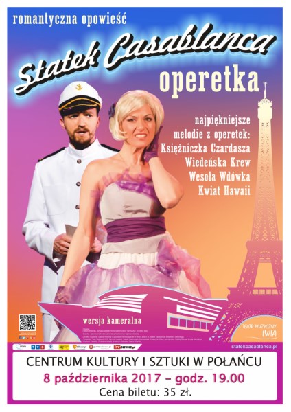 Po raz drugi zapraszamy do świata operetki. Widowisko "Statek Casablanca" to muzyczna opowieść o pięknym romansie z towarzyszącą mu miłosną intrygą i komizmem. W spektaklu nie brak zabawnych tekstów i nawiązań do kultowego filmu "Casablanca". Uczestnicy rejsu będą świadkami zaręczyn właściciela statku z piękną i tajemniczą kobietą. Jednym z przypadkowych gości jest również amerykański marynarz - dawna miłość naszej bohaterki. Nieoczekiwany rozwój wydarzeń widzowie będą śledzić z zapartym tchem. Warto wyruszyć w podróż pełną zawawy, uśmiechu, niezapomnianych wrażeń, a co ważne bez choroby morskiej. Nie zabraknie oszałamiających, pełnych kolorów kostiumów i efektów specjalnych.Gwarantujemy, że czas szybko upłynie przy akompaniamencie najpiękniejszych klasycznych melodii ze znanych operetek i oper.