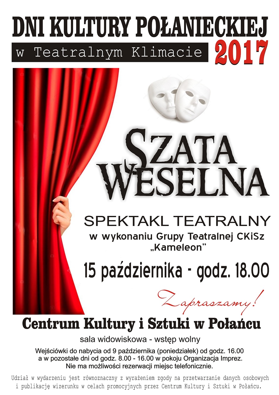Przed nami kolejne działanie w ramach Dni Kultury Połanieckiej "W teatralnym klimacie". 15 października o godz. 18.00 zapraszamy na przedstawienie "Szata Weselna" w wykonaniu Grupy Teatralnej "Kameleon" działającej w Centrum Kultury i Sztuki w Połańcu. Spektakl powstał na kanwie opracowań dzieł Moliera, poświęcony pamięci Pani Krystyny Orlicz.