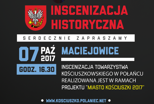 Sekcja historyczna Towarzystwa Kościuszkowskiego w Połańcu serdecznie zaprasza na inscenizację historyczną „Insurekcja 1794 w pigułce” w wykonaniu uczniów z połanieckich szkół, wśród których są członkowie naszego Szkolnego Towarzystwa Kościuszkowskiego, ramach projektu: „Miasto Kościuszki 2017”. Inscenizacja odbędzie się w dniu 7 października 2017 r. o godz. 16.30 na polach Bitwy pod Maciejowicami, podczas uroczystości związanych z XXXIV Międzynarodowym Sympozjum Kościuszkowskiego organizowanym przez Polską Fundację Kościuszkowską, Towarzystwo Miłośników Maciejowic, Towarzystwo Miłośników Historii, Starostwo Powiatowe Garwolin, Wójta i Radę Gminy Maciejowice, Muzeum T. Kościuszki i GOK w Maciejowicach, PSP i ZS w Garwolinie, Muzeum Niepodległości w Warszawie, Ludowe Towarzystwo Naukowo-Kulturalne w Garwolinie i Stowarzyszenie Współpracy “Polska-Wschód”.