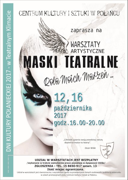 Zapraszamy na 3 działanie w ramach Dni Kultury połanieckiej "W teatralnym klimacie". W dniach 12-16 października w godz. 16.00 - 20.00 odbędą się warsztaty artystyczne "Maski Teatralne - rola moich marzeń". Zapisy w Centrum Kultury i Sztuki w Połańcu w pokoju Organizacja Imprez lub telefonicznie pod numerem tel. 158650917 wew. 13. Liczba miejsc ograniczona. Zapraszamy.