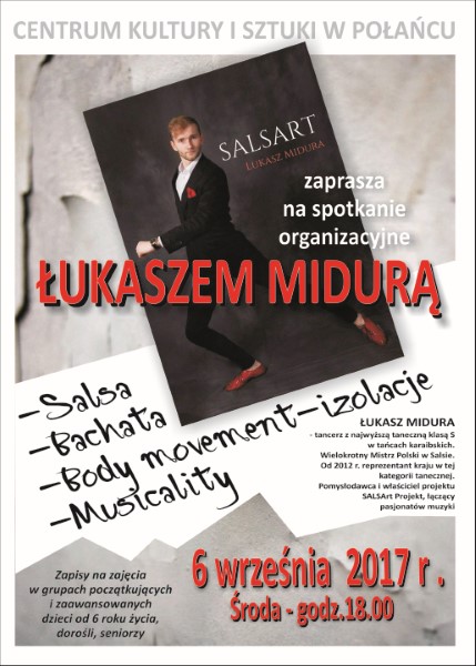 Zapraszamy wszystkich 6 września o godz. 18.00 (środa) do Centrum Kultury i Sztuki w Połańcu (sala widowiskowa) na spotkanie organizacyjne z Łukaszem Midurą i zapisy na nowe formy taneczne: salsa, bachata, body movement - izolacje i musicality. Zajęcia dla wszystkich w grupach początkujących i zaawansowanych. Wiek uczestników: dzieci od 6 lat, dorośli, seniorzy.