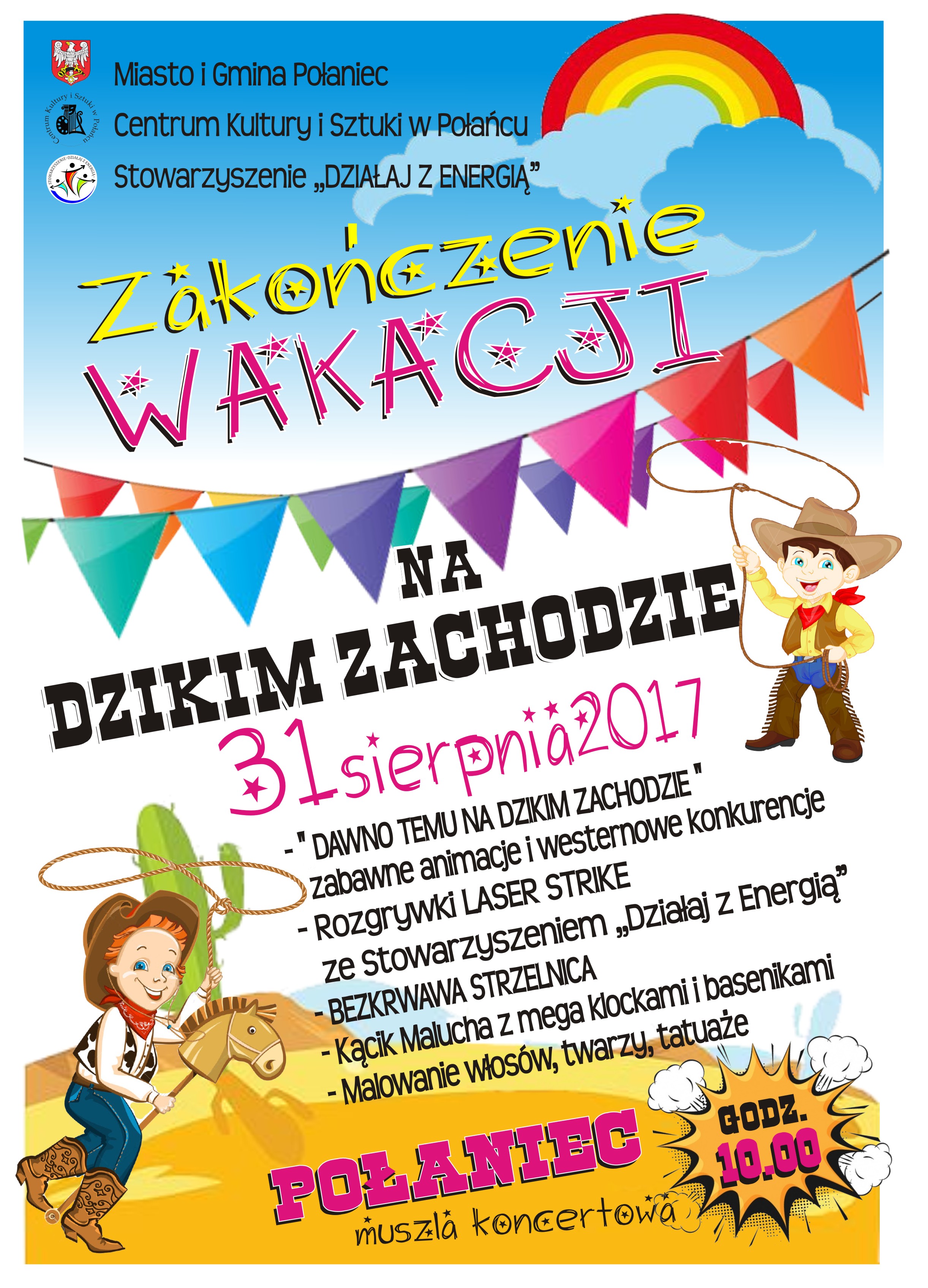 Zapraszamy dzieci i młodzież na "Zakończenie wakacji na Dzikim Zachodzie". Impreza odbędzie się 31 sierpnia o godz. 10.00 na muszli koncertowej w Połańcu. W programie mnóstwo atrakcji i dobrej zabawy dla każdego i dużego i małego; między innymi: westernowe konkurencje i zabawne animacje, Laserowa Bitwa, Bezkrwawa Strzelnica, Kącik Malucha i wiele innych....
