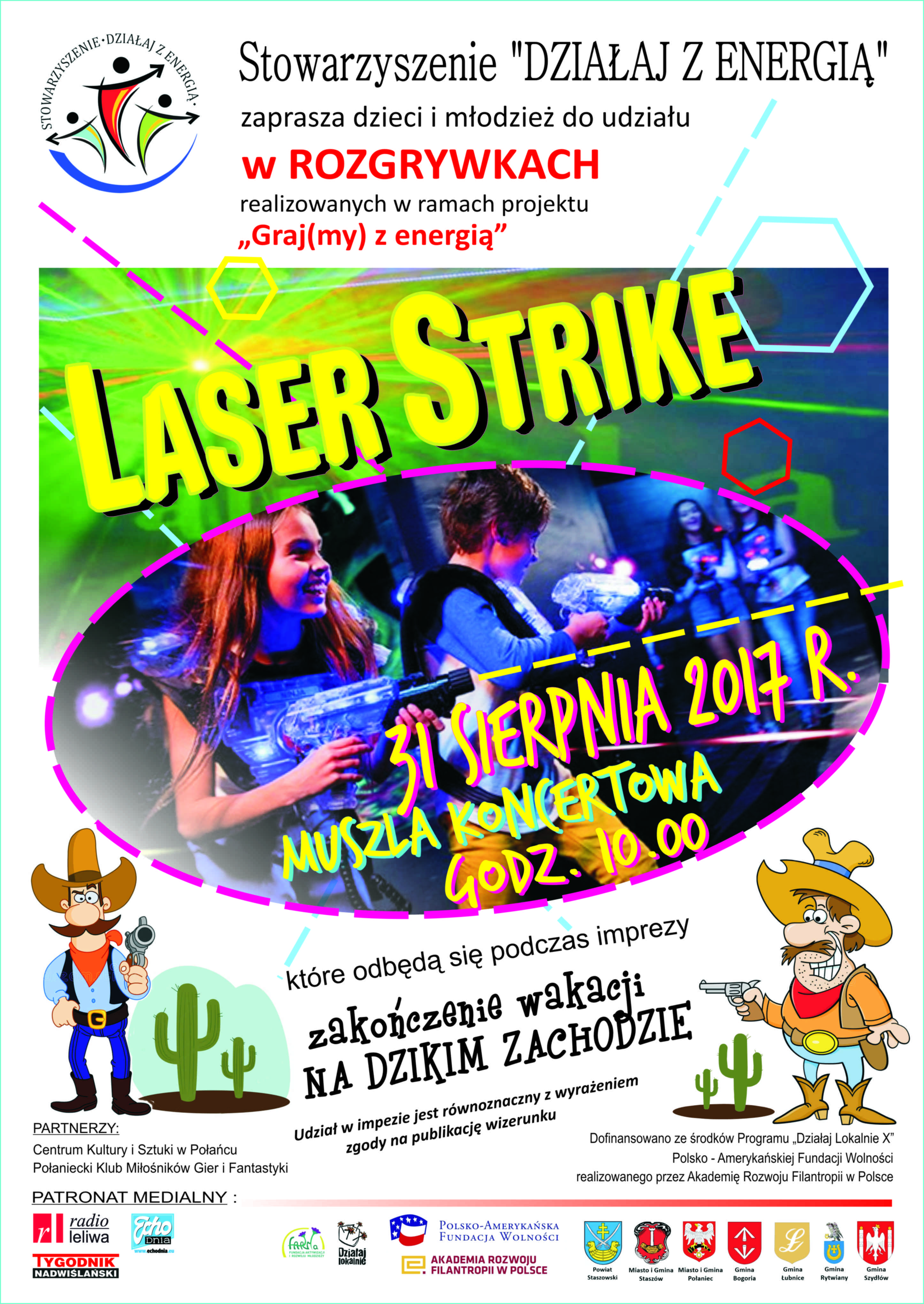 Przed Stowarzyszeniem "DZIAŁAJ Z ENERGIĄ" kolejne działanie w ramach projektu "GRAJ(MY) Z ENERGIĄ". Drugie spotkanie z LASER STRIKE odbędzie się 31 sierpnia o godz. 10.00 na muszli koncertowej w Połańcu podczas "Zakończenia wakacji na Dzikim Zachodzie". Zapraszamy wszystkich lubiących gry strategiczne i bezkrwawe strzelanki.