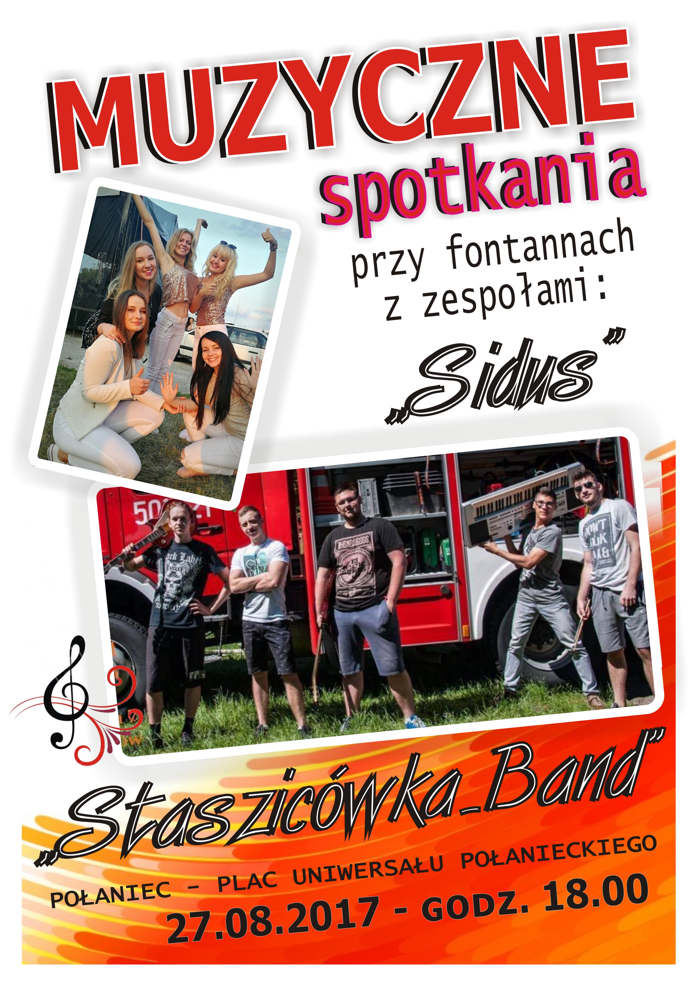 Zapraszamy na kolejne Muzyczne spotkanie przy fontannach. 27 sierpnia o godz. 18.00 wystąpi Zespół SIDUS i STASZICÓWKA BAND....
