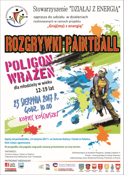 Przed nami kolejne działanie w ramach projektu "GRAJ(MY) Z ENERGIĄ!". 23 sierpnia (środa) godz. 10.00 okolice Kopca Kościuszki w Połańcu zamienią się w POLIGON WRAŻEŃ - rozgrywki paintballowe. Zapewniamy kompletny strój, maskę, sprzęt, profesjonalne szkolenie i oczywiście super drużyny i moc wrażeń. Do udziału w rozgrywkach zapraszamy młodzież w wieku 12 - 19 lat. Nie siedźcie w domu ...ZAGRAJCIE Z ENERGIĄ....