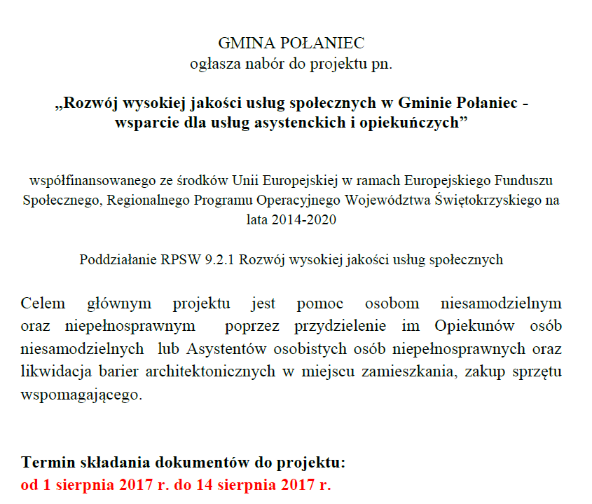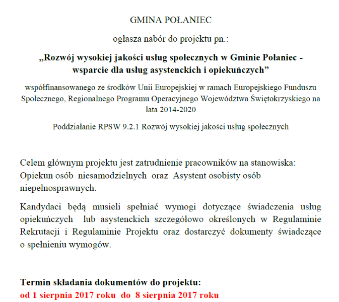Rekrutacja odbywa sie w biurze projektu w Urzędzie miasta i gminy Połaniec pok. 226 tel. kontaktowy 865 82 66