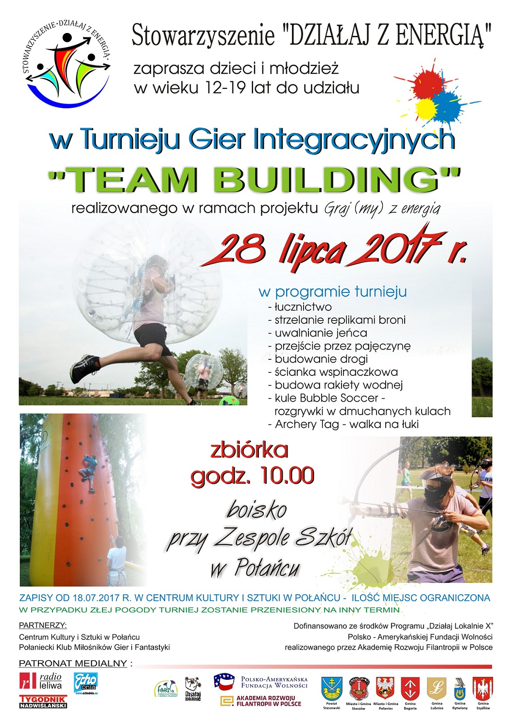 Stowarzyszenie „Działaj z Energią” zaprasza dzieci i młodzież w wieku 12-19 lat na Turniej Gier Integracyjnych „TEAM BUILDING” - pierwsze działanie w ramach realizowanego projektu „GRAJ (MY) Z ENERGIĄ”. Startujemy 28.07.2017 r. o godz. 10.00; zbiórka na boisku przy Zespole Szkół w Połańcu.