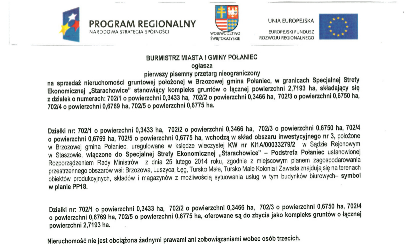 Ogłoszenie pierwszego pisemnego przetargu nieograniczonego na sprzedaż nieruchomości gruntowej położonej w Brzozowej gmina Połaniec, w granicach Specjalnej Strefy Ekonomicznej „Starachowice”