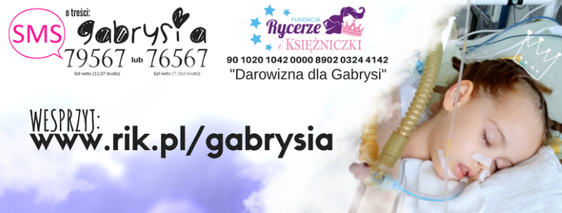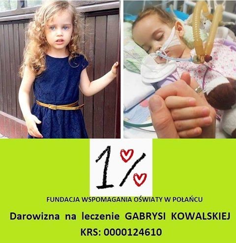 Nie sposób patrzeć obojętnie, gdy małe i niczemu niewinne dziecko musi heroicznie walczyć o swoje zdrowie. Tak jest w przypadku 4 - letniej Gabrysi Kowalskiej, która 28 marca 2017 roku przeszła operację usunięcia części guza z jej ślicznej główki. Reszta owinęła się wokół tętnic. Gabi, której mama pochodzi z Połańca, musi walczyć z Pineoblastomą - rzadkim i złośliwym nowotworem. Obecnie Gabrysia jest w śpiączce. Czeka ją rehabilitacja, suplementacja, diagnostyka w kierunku dalszego leczenia. Fundacja Rycerze i Księżniczki prowadzi zbiórkę publiczną celem pozyskania środków finansowych niezbędnych do pokrycia kosztów leczenia. Wspomóżmy małą Gabrysię i jej dzielnych rodziców. Przyłączmy się do akcji i okażmy swoje serce dla tej ślicznej księżniczki. Wspólnie na pewno pomożemy Gabrysi na nowo cieszyć się zdrowiem.