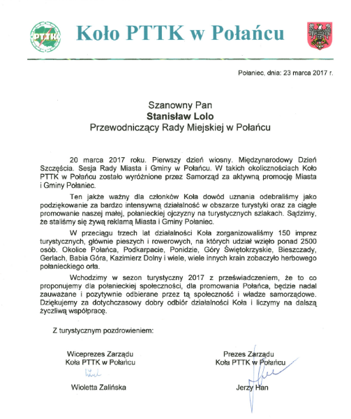 Aktywiści wyrażając wdzięczność za docenienie środowiska turystycznego przekazali na ręce Przewodniczącego Rady Miejskiej – Stanisława Lolo słowa uznania i podziękowania z zapewnieniem o dalszej aktywności i z nadzieją na owocną współpracę.