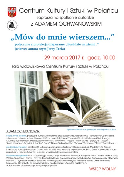 Serdecznie zapraszamy 29 marca o godz. 10.00 do Centrum Kultury i Sztuki w Połańcu na spotkanie autorskie z Adamem Ochwanowskim "Mów do mnie wierszem....". W programie prezentacja wierszy w wykonaniu Jerzego Treli i projekcja diaporamy "Ponidzie na ziemi...." Adam Ochwanowski to pochodzący ze Złotej Pińczowskiej poeta, działacz kultury, autor kilkunastu tomów wierszy, tekstów piosenek, scenariuszy teatralnych.