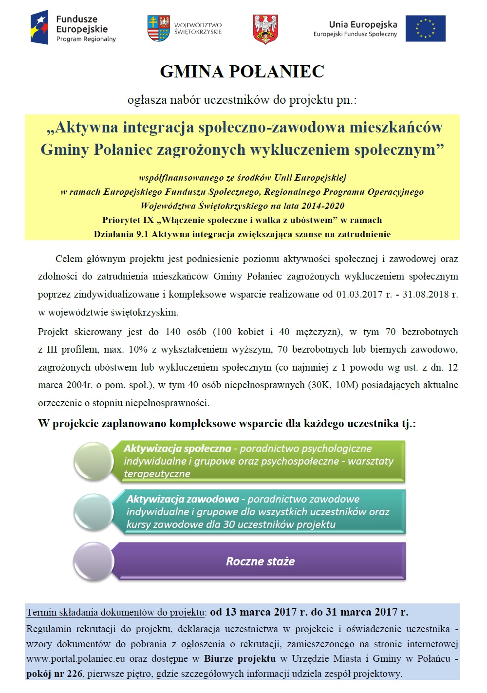 To już kolejne dofinansowanie jakie gmina Połaniec w ostatnim czasie pozyskała. 8 marca 2017 roku została podpisana pre- umowa w ramach Regionalnego Programu Operacyjnego Województwa Świętokrzyskiego na lata 2014 – 2020 na projekt dot. przygotowania pomieszczeń poddasza wraz z zagospodarowaniem terenu wokół budynku w kierunku ludzi starszych. Umowę podpisał marszałek woj. świętokrzyskiego – Adam Jarubas, członek zarządu - Marek Szczepanik po stronie woj. świętokrzyskiego, a po stronie Gminy Połaniec – Jacek Tarnowski, przy kontrasygnacie skarbnik – Małgorzaty Żugaj. Wartość zadania to 776 437, 42 zł, dofinansowanie 659 971, 81 zł, wkład własny 116 456,61 zł.