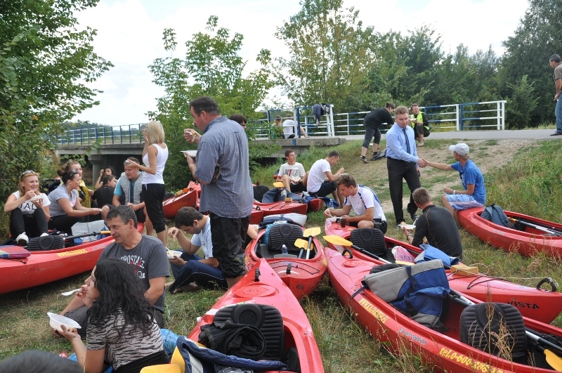 Na trasie zaplanowano jeden postój i ciepły posiłek w Rudnikach, gdzie wszyscy uczestnicy spływu mogli odpocząć i nabrać sił na dalszą podróż. Tu wszystkich uczestników powitał i dopingował do dalszych zmagań Burmistrz Połańca – Jacek Tarnowski. Około godziny 13:00 wszyscy uczestnicy przepłynęli obok Kościoła Św. Marcina w Połańcu, by zakończyć spływ wspólnym ogniskiem i grillem w miejscowości Winnica.