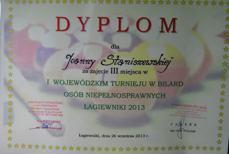 26 września grupa sportowa z połanieckiego WTZ wystąpiła w I Wojewódzkim Turnieju w Bilard Osób Niepełnosprawnych – Łagiewniki 2013. Świetny występ i wysokie III Miejsce zapewniła sobie Joanna Staniszewska podopieczna WTZ Połaniec. W zawodach wzięli udział również Grzegorz Paceński i Mariusz Kowalik.