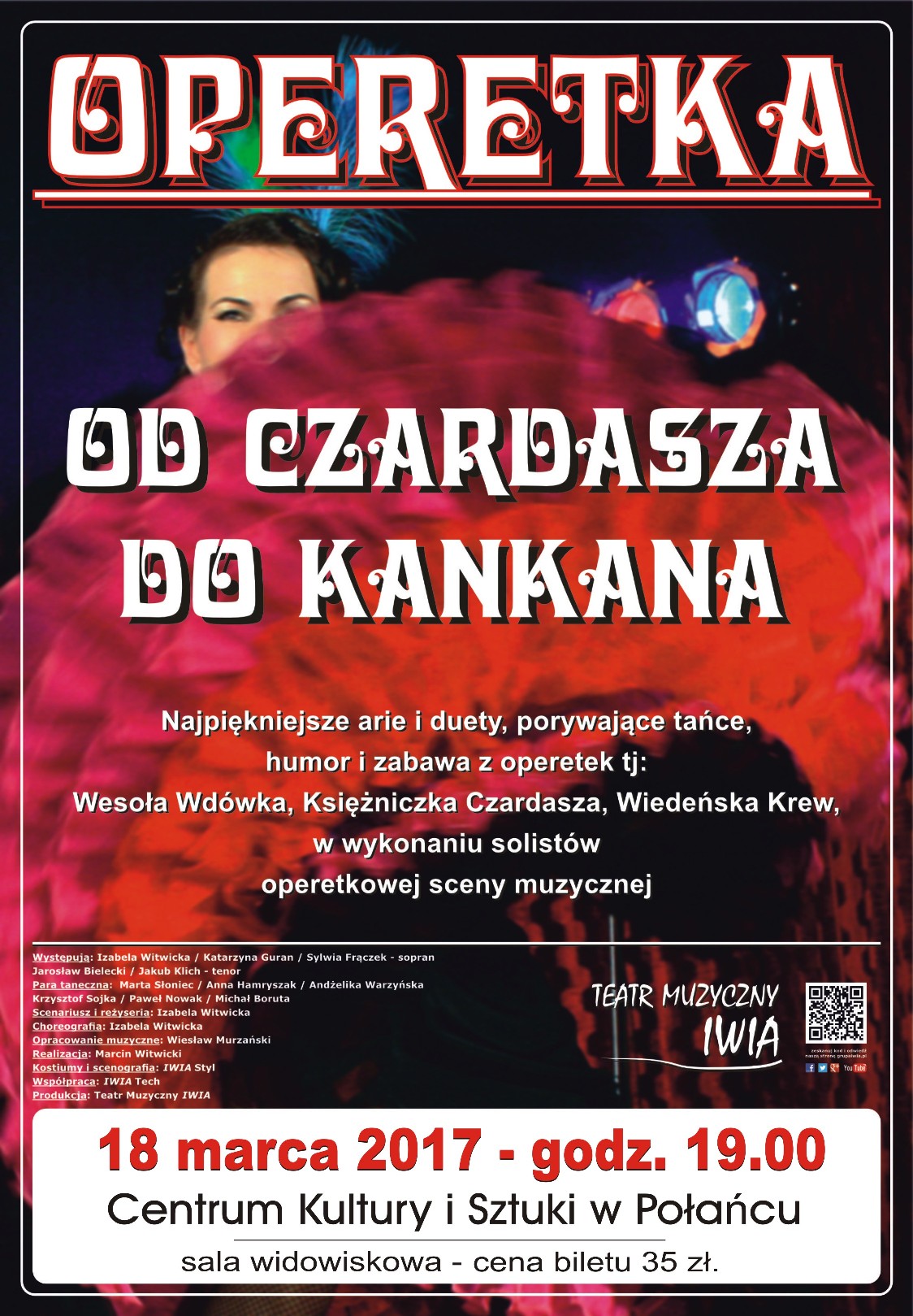Zapraszamy do świata operetki pełnego humoru i zabawnych sytuacji. Widowisko "Od Czardasza Do Kankana" to muzyczna opowieść rozgrywająca się w salonach arystokratów, którzy znudzeni codziennością planują ucieczkę w tajemnicy przed wszystkimi. Między pozostawionym w domu lokajem i pokojówką dochodzi do zabawnych sytuacji, a ich namiętność i przekorna miłość do siebie, stają się doskonałą historią, na tle której rozbrzmiewają najpiękniejsze melodie z operetek : Wesoła Wdówka, Księżniczka Czardasza, Hrabina Marica. Porywająca choreografia straussowskiego walca, polki oraz offenbachowskiego Kankana, wyśmienita gra aktorskagwarantuje świetną zabawę z dużą ilością muzyki, tańca i humoru.