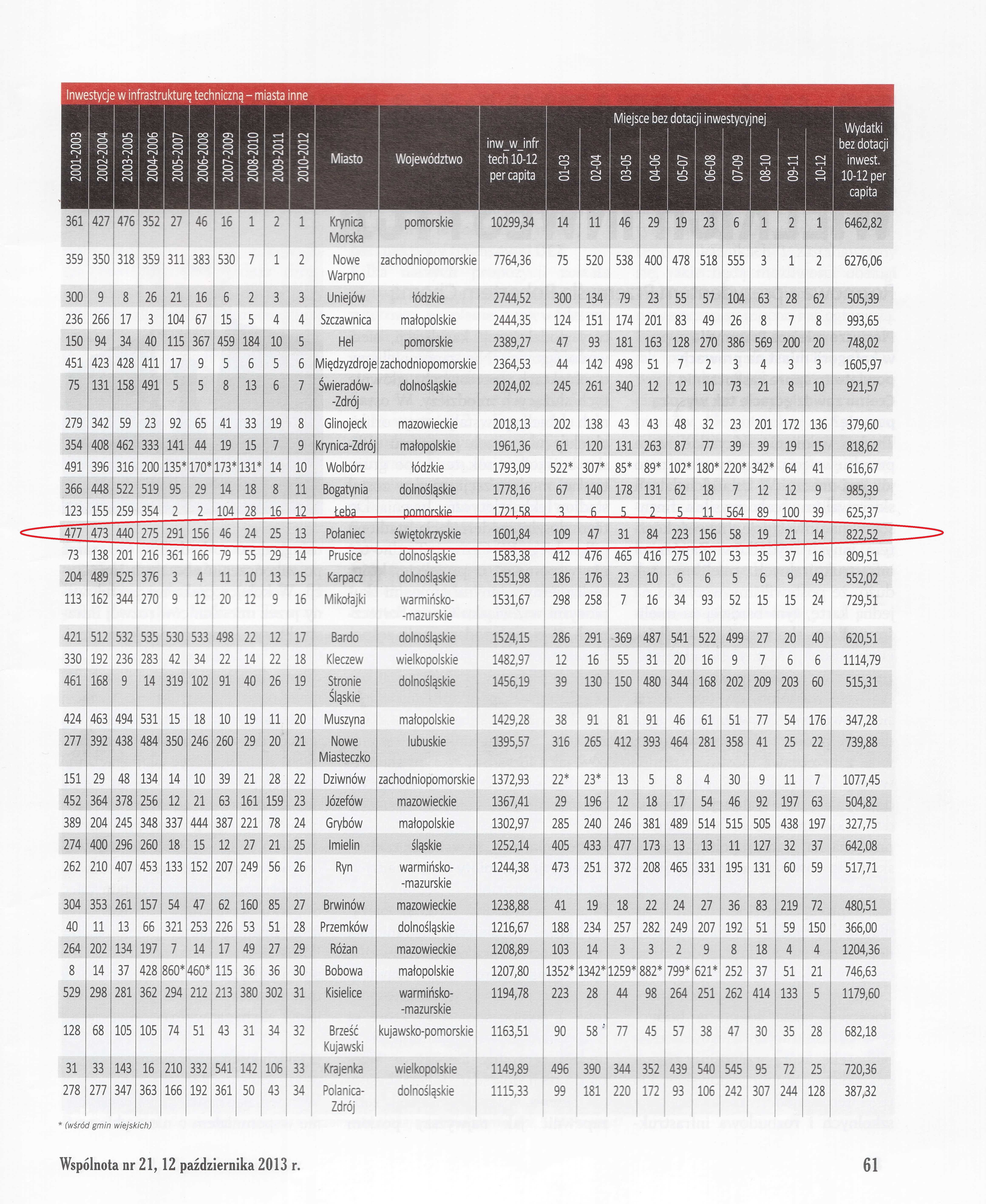 W najnowszym – październikowym wydaniu dwutygodnika „Wspólnota” został opublikowany ranking ogólnopolski obejmujący inwestycje samorządów terytorialnych w infrastrukturę techniczną w latach 2010 – 2012. W kategorii miasta inne na bardzo wysokiej 13 pozycji został sklasyfikowany Połaniec co daje 1 miejsce w województwie świętokrzyskim.