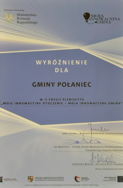 Podczas XXXVI Sesji Sejmiku Województwa Świętokrzyskiego wręczona została nagroda oraz wyróżnienia w Plebiscycie pn. ”Moje Innowacyjne Otoczenie - Moja Innowacyjna Gmina”, do którego przystąpiła również Gmina Połaniec. Organizatorem plebiscytu było Województwo Świętokrzyskie – Urząd Marszałkowski Województwa Świętokrzyskiego – Biuro Innowacji. Plebiscyt skierowany był do gmin miejsko-wiejskich i wiejskich województwa świętokrzyskiego, a celem była aktywizacja gmin wiejskich, promocja prorozwojowych działań i rozwiązań, a tym samym promocja jednostek samorządu terytorialnego, które wspierają działania innowacyjne na swoim terenie.