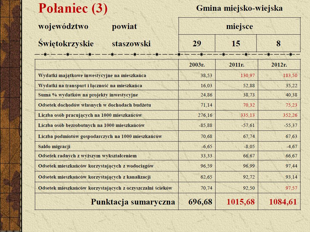 Wyniki rankingu odzwierciedlają, w sposób wiarygodny i przekrojowy, rozwój polskich jednostek samorządu lokalnego i wskazują liderów w podziale na gminy wiejskie, miejsko-wiejskie, miejskie oraz miasta na prawach powiatu. To już pewne, że tytuł lidera w naszym województwie bez żadnego wahania przypada dla Połańca. Z tego tytułu preferencje należą się dla naszych mieszkańców, którzy sumiennie i efektywnie pracują na wszystkie zaszczyty i nagrody - doskonale promując gminę.