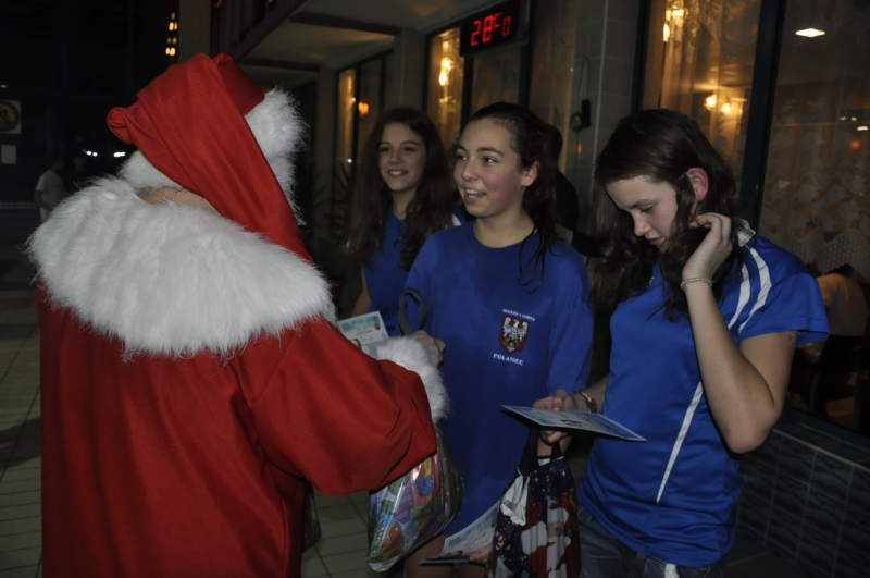 Atmosfera była prawdziwie mikołajkowa. Podczas sportowych zmagań na basenie pojawił się św. Mikołaj z długą białą brodą, aby rozdać paczki z łakociami. Były też dyplomy i puchary dla młodych sportowców. Świątecznemu klimatowi ulegli też gratulujący zawodnikom i wręczający nagrody Burmistrz Miasta i Gminy Połaniec – pan Jacek Tarnowski, Przewodniczący Rady Miejskiej – pan Stanisław Lolo, Dyrektor Ośrodka Sportu i Rekreacji – pani Karolina Koper – Adamczak oraz pani Ewa Kuc – LKS „DELFIN” Połaniec.
