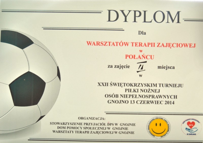 13 czerwca podopieczni WTZ wzięli udział w XXIII Świętokrzyskim Turnieju Piłki Nożnej Osób Niepełnosprawnych GNOJNO 2014. 8 piłkarzy w składzie: Rafał Marzec, Mariusz Kowalik, Rafał Konys, Krzysztof Kwiatkowski, Grzegorz Paceński, Zbigniew Wojdan, Rafał Gromniak i Rafał Śliski zajęli II zaszczytne Miejsce w Turnieju wśród 10 startujących drużyn. Organizatorem zawodów było Stowarzyszenie Przyjaciół DPS w Gnojnie, Dom Pomocy Społecznej w Gnojnie oraz Warsztaty Terapii Zajęciowej w Gnojnie.