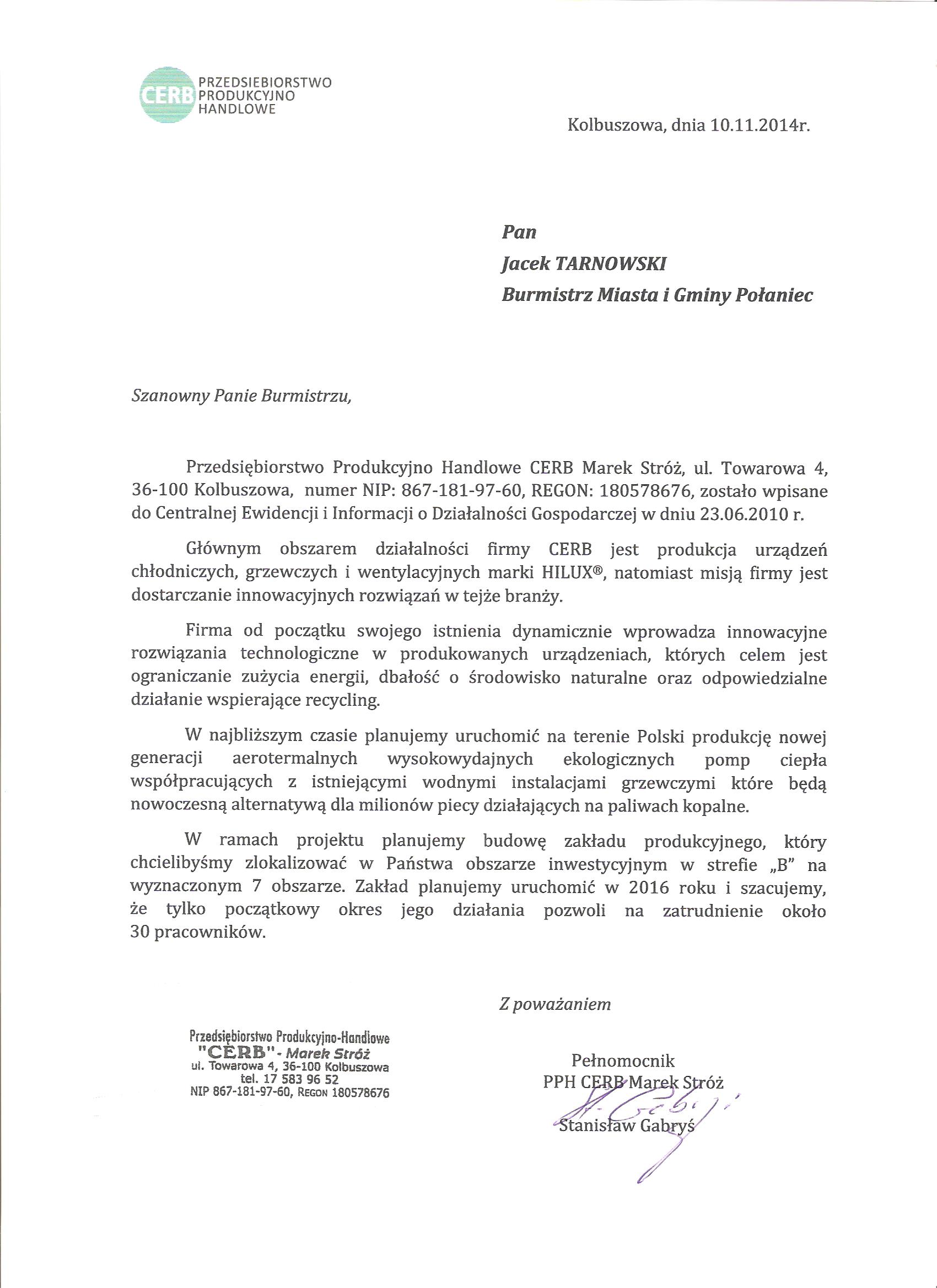 Przedsiębiorstwo Produkcyjno – Handlowe „CERB” Marek Stróż z siedzibą w Kolbuszowej chce wybudować na obszarze 7 strefy B, zakład produkcyjny produkujący nowej generacji aerotermalne wysokowydajne ekologiczne pompy ciepła współpracujące z istniejącymi wodnymi instalacjami grzewczymi, które będą nowoczesną alternatywą dla milionów piecy działających na paliwa kopalne.