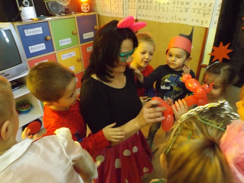 Dzień później – 12 lutego swój bal karnawałowy miały dzieci z Przedszkola Publicznego w Połańcu Filia nr 2, które bawiły się w swojej placówce. Wesołe tańce i zabawy sprawiły dzieciom wiele radości. Wiele niespodzianek i konkursów z kolorowych balonów wyczarowała dla dzieci Pani Ania Sroka mama Wiktorii, która jest animatorem zabaw. Głównym punktem programu była piniata w kształcie Myszki Miki.