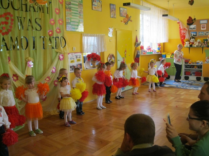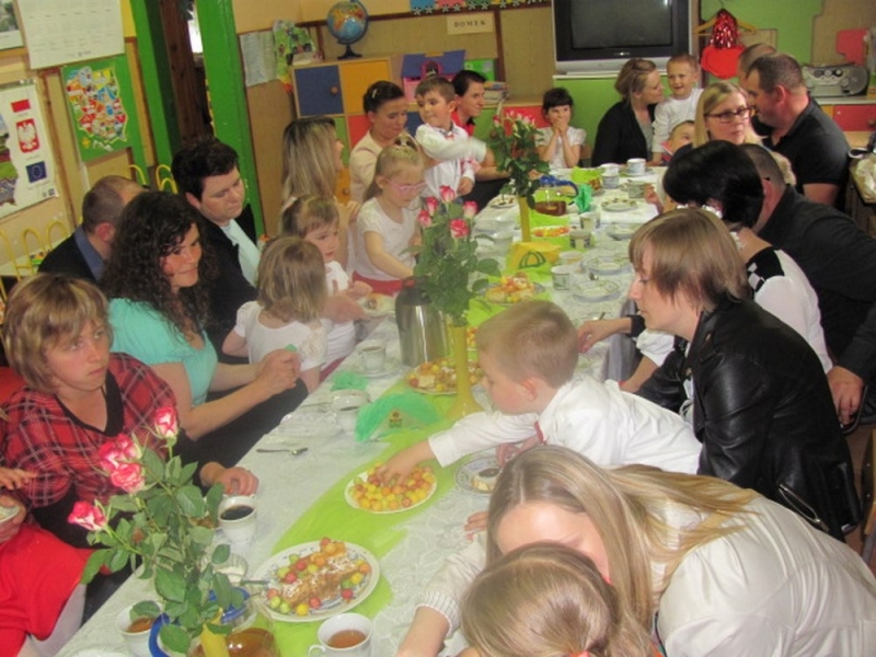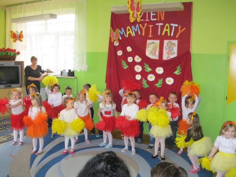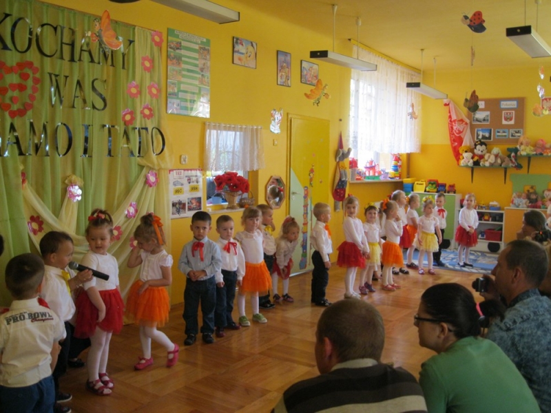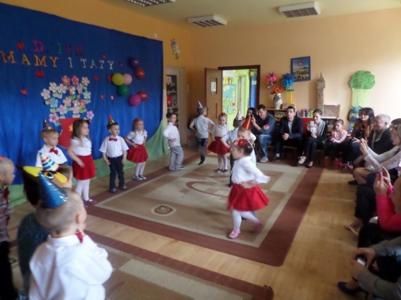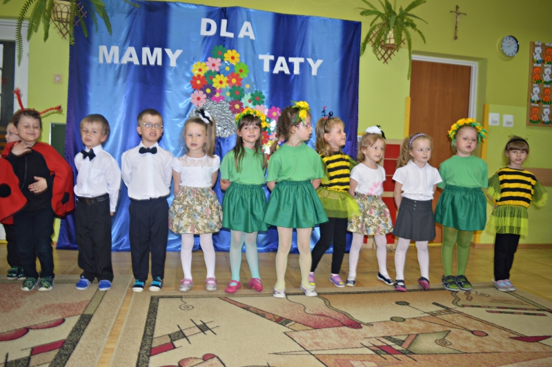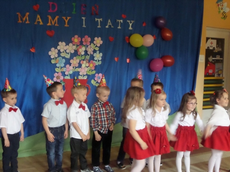 Mama i tata są to wielkie słowa, które posiadają ogromne znaczenie, są bowiem synonimem miłości, szczęścia, a także ciepła rodzinnego. Zaś pierwszymi słowami, które wypowiada każde dziecko w swoim życiu to właśnie: MAMA i TATA. Więź pomiędzy dzieckiem, a rodzicem należy budować, pielęgnować, a także troszczyć się o nią od najmłodszych lat. Gdyż rodzic to najważniejsza osoba w życiu dziecka. Dlatego jak co roku w naszym przedszkolu jest organizowany Dzień Matki i Ojca, dzięki któremu nasze pociechy mogą wyrazić swoją miłość do rodziców.Dzieci zaprosiły swoich rodziców do wspólnego świętowania. Z okazji Dnia Matki i Ojca sala przedszkolna stała się sceną, na której dzieci w pięknych strojach prezentowały programy artystyczne – recytowały wiersze, śpiewały piosenki nie zabrakło też tańców i zabaw. Podczas wręczania własnoręcznie wykonanych laurek całusom i uściskom nie było końca. Po występach wszyscy zasiedli do słodkiego poczęstunku. Atmosfera tej uroczystości była wspaniała. Radość oraz zadowolenie było widać na twarzach dzieci, a także ich rodziców. I choć takie święto kochani rodzice obchodzą raz do roku, to wzruszenia pozostają na długo w pamięci. Bardzo dziękujemy wszystkim zaproszonym za zaszczycenie nas swoją obecnością. Pragniemy również złożyć serdeczne podziękowania za zaangażowanie wszystkim, którzy przyczynili się do występów dzieci, że zadbali o ich piękny ubiór oraz poczęstunek.