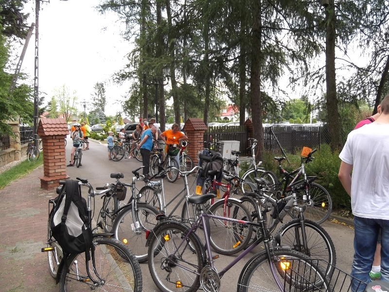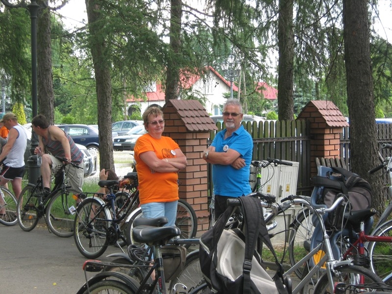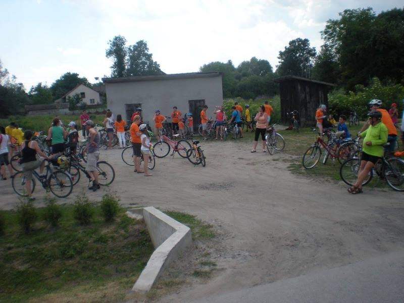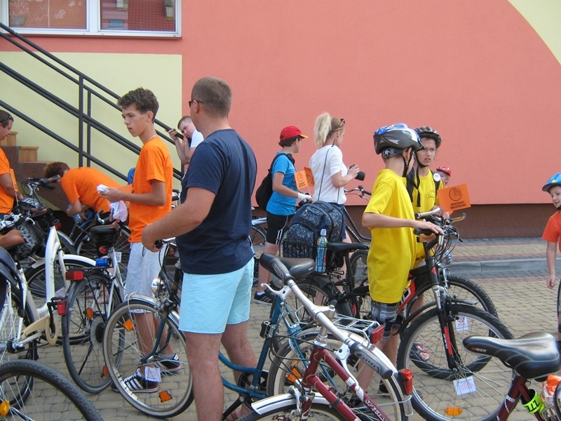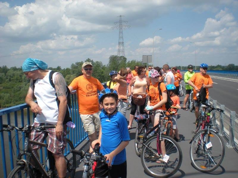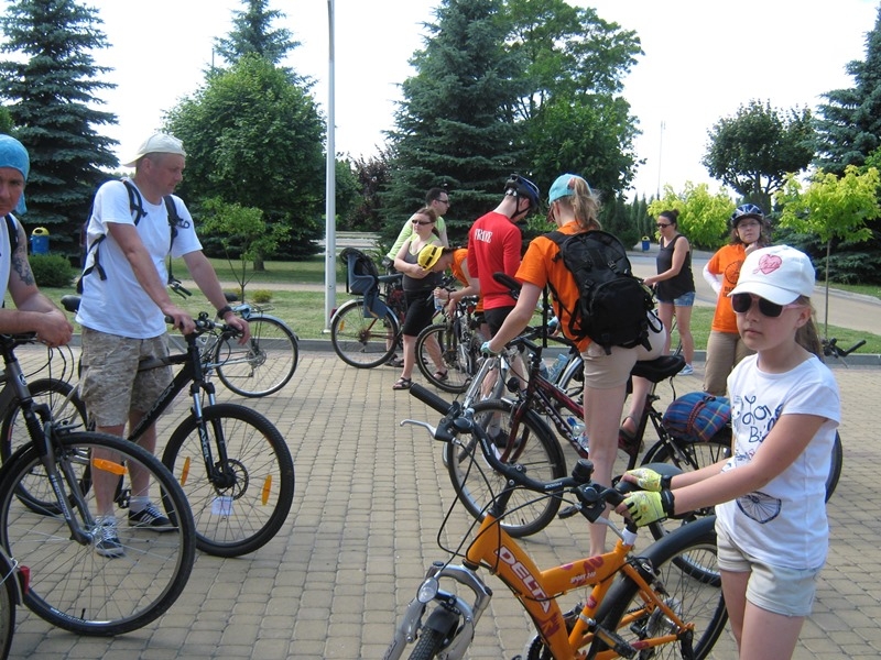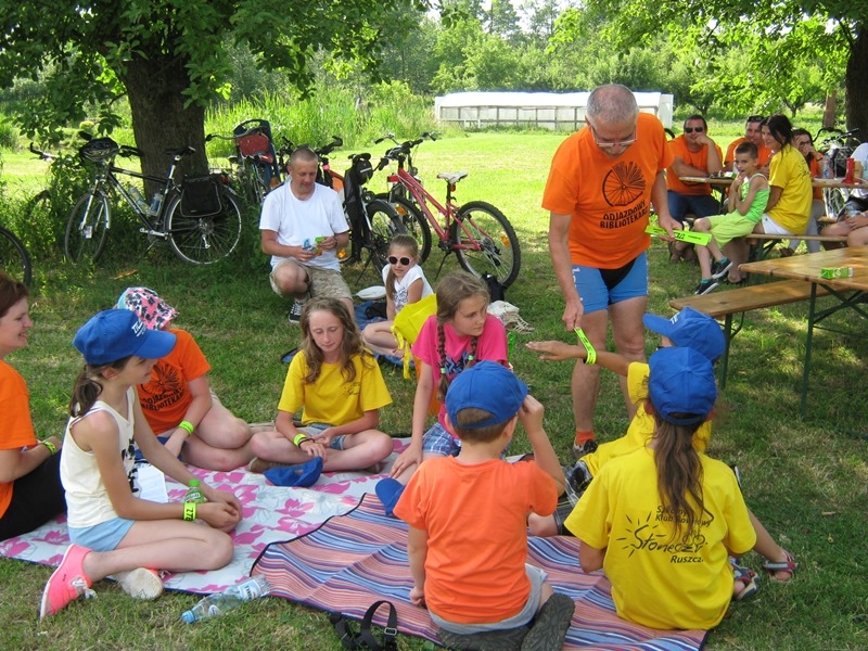 Pogoda do końca trzymała nas w napięciu. Prognozy nie były dla nas optymistyczne: zapowiadano bardzo wysokie temperatury i duże ryzyko burz. Zastanawiało nas, czy w ogóle ktoś zdobędzie się na odwagę, by z nami pojechać. Mimo upału, w myśl motta: „Nie ma złej pogody, są tylko słabe charaktery”, na starcie zjawiło się blisko 60 osób: sympatyków Biblioteki, miłośników rowerów, członków PTTK oraz bibliotekarzy. Liczną grupę stanowiły dzieci i młodzież. Podobnie jak w roku ubiegłym dołączyła do nas grupa dzieci i młodzieży ze szkolnego klubu rowerowego „Słoneczni”, która miała do pokonania nieco więcej kilometrów, ponieważ wyruszyła spod siedziby Filii Bibliotecznej w Ruszczy. Towarzyszyła im od początku do końca jedna z naszych koleżanek bibliotekarek pracująca w Filii.