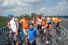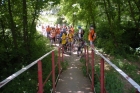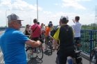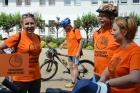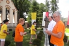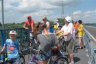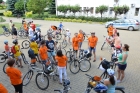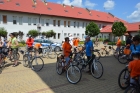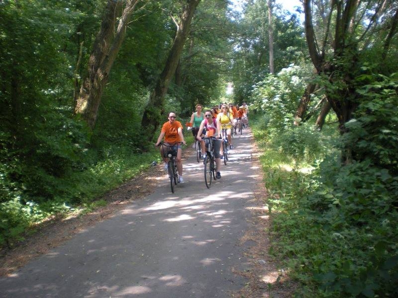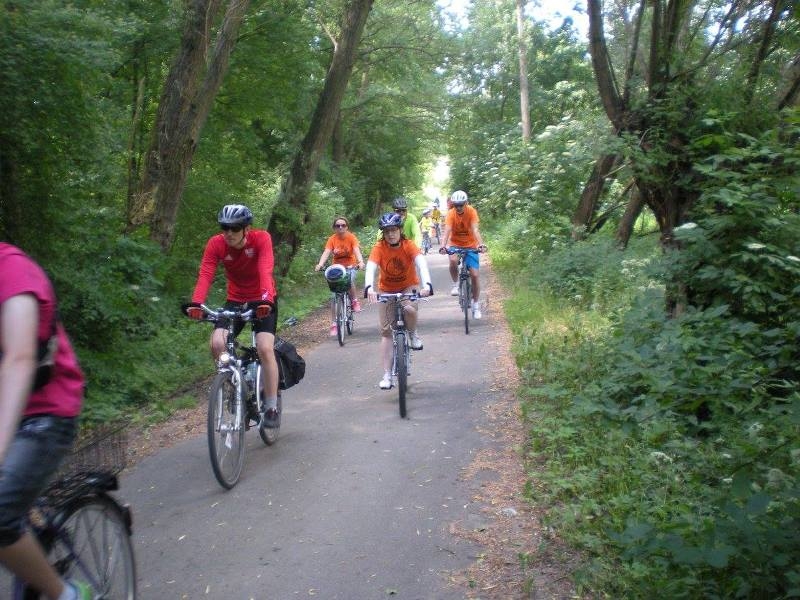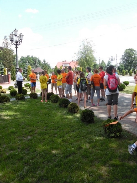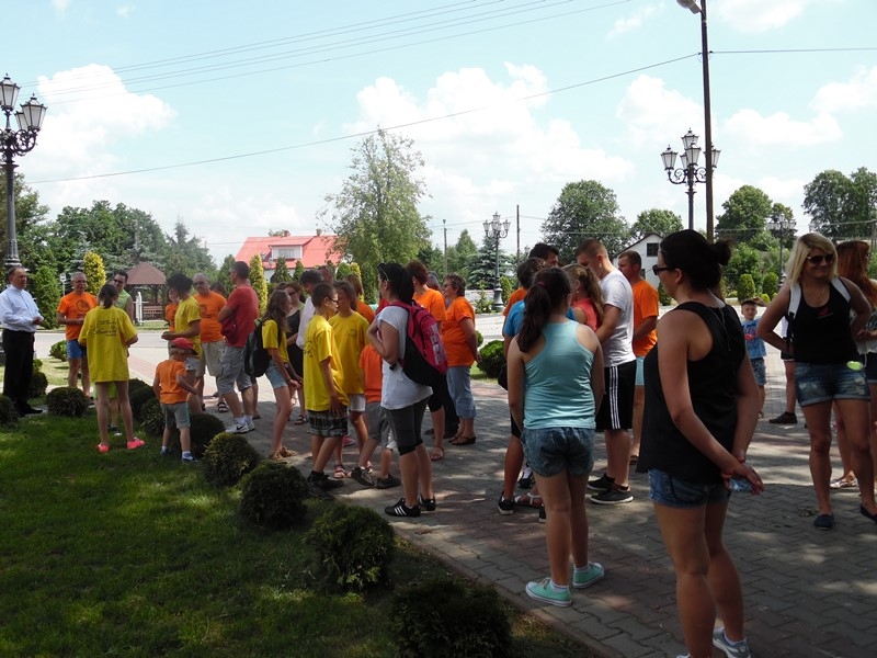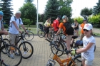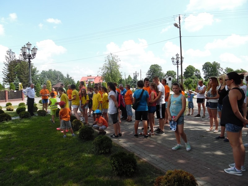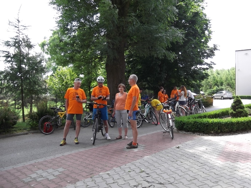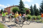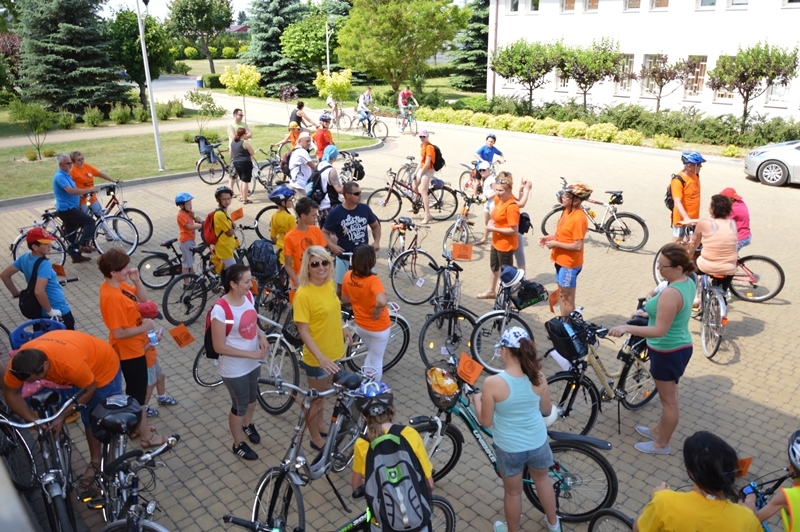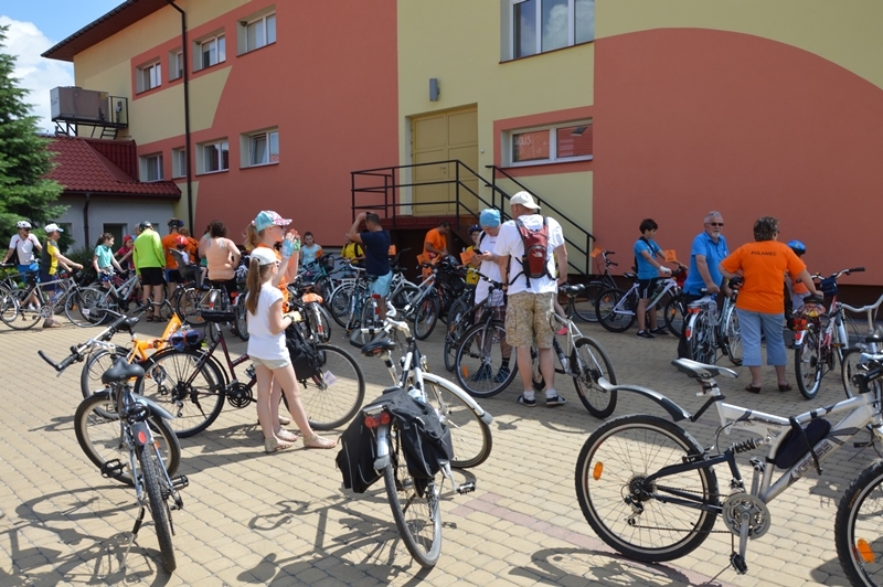 Pogoda do końca trzymała nas w napięciu. Prognozy nie były dla nas optymistyczne: zapowiadano bardzo wysokie temperatury i duże ryzyko burz. Zastanawiało nas, czy w ogóle ktoś zdobędzie się na odwagę, by z nami pojechać. Mimo upału, w myśl motta: „Nie ma złej pogody, są tylko słabe charaktery”, na starcie zjawiło się blisko 60 osób: sympatyków Biblioteki, miłośników rowerów, członków PTTK oraz bibliotekarzy. Liczną grupę stanowiły dzieci i młodzież. Podobnie jak w roku ubiegłym dołączyła do nas grupa dzieci i młodzieży ze szkolnego klubu rowerowego „Słoneczni”, która miała do pokonania nieco więcej kilometrów, ponieważ wyruszyła spod siedziby Filii Bibliotecznej w Ruszczy. Towarzyszyła im od początku do końca jedna z naszych koleżanek bibliotekarek pracująca w Filii.