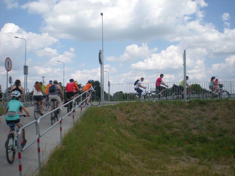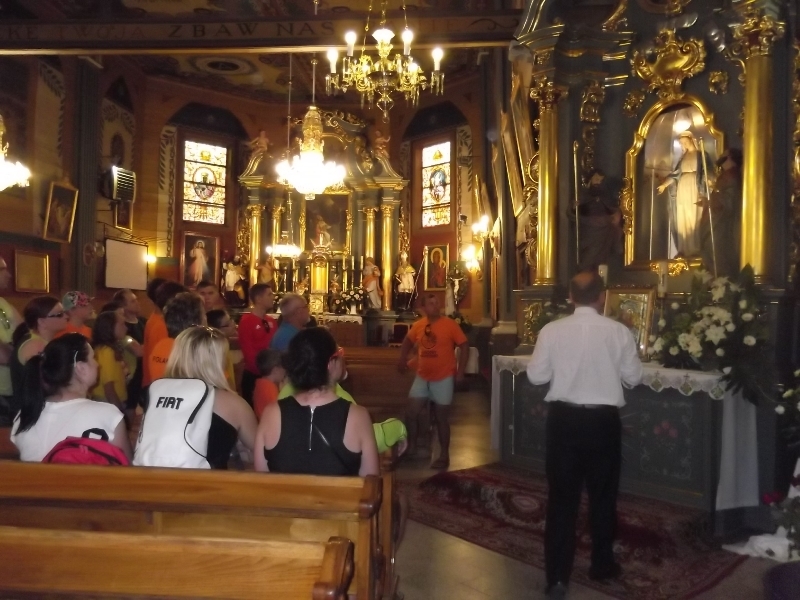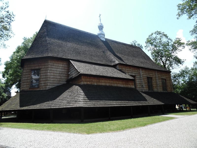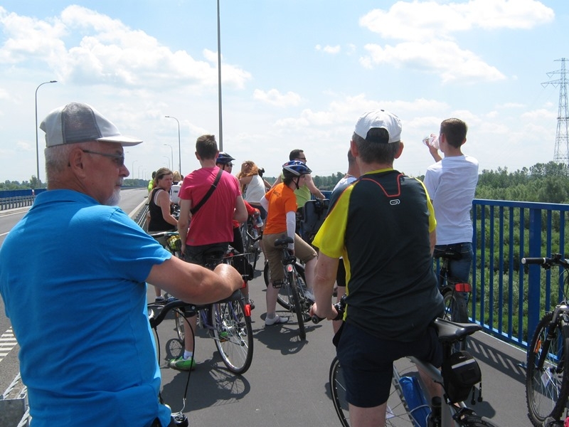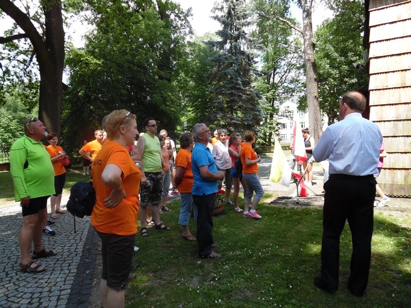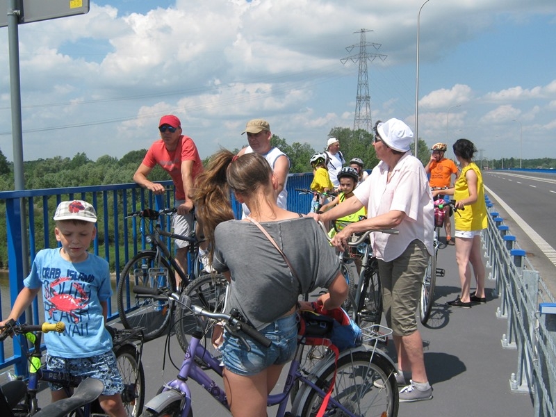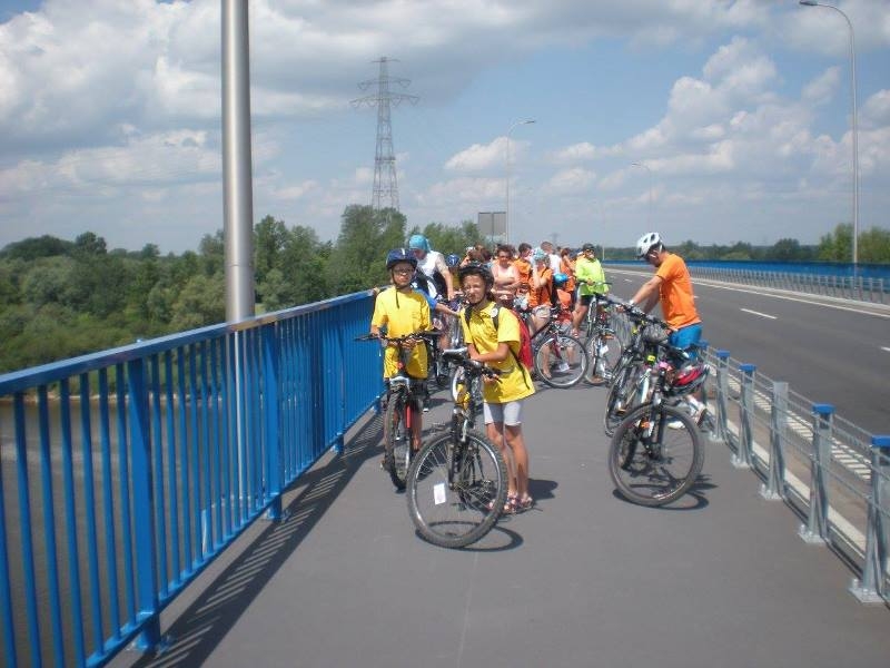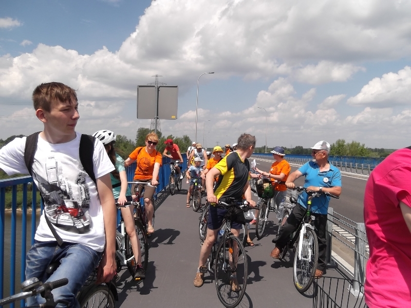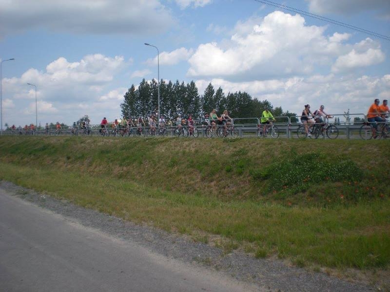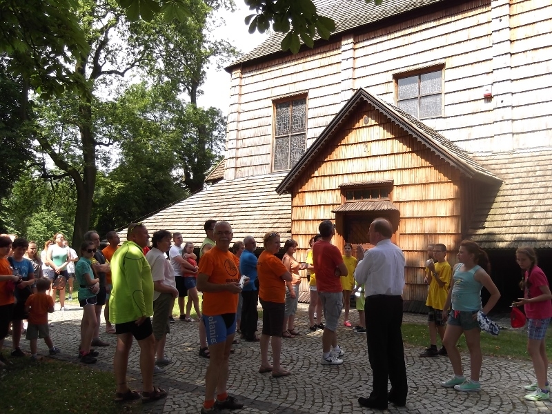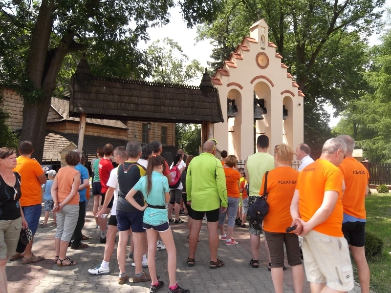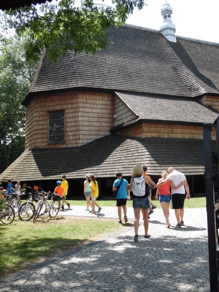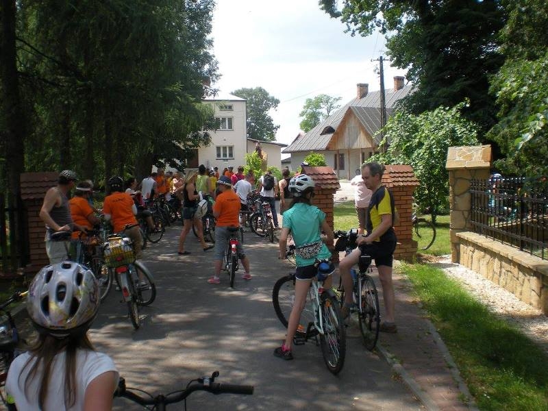 i pozostawiając za sobą Kopiec Kościuszki skierował się w stronę Winnicy. Dalej bocznymi drogami kolarze dotarli do pierwszej przeprawy mostowej – kładki na rzece Czarnej. Należało zsiąść z rowerów i przeprowadzić je na drugą stronę. Po chwili na horyzoncie pojawił się zarys mostu na Wiśle łączącego województwo świętokrzyskie z podkarpackim. Dojazd do niego był bardzo przyjemny, ponieważ mieliśmy wspaniały widok na pola usiane makami. Niemal dwukilometrowy przejazd przez trzy mosty na Wiśle, Brniu i Wisłoce także okazał się przyjemny i bezpieczny dzięki wydzielonej ścieżce rowerowej. Rzut beretem za mostami były już nasze docelowe Gawłuszowice. Miejscowość, jak to bywa w dzień wolny od pracy, powitała nas w sennym nastroju. Po dotarciu do parku otaczającego kościół parafialny pod wezwaniem św. Wojciecha był czas na krótki odpoczynek. Po nim przywitanie przez księdza proboszcza Witolda Szczura, który oprowadził nas po kościele, bardzo ciekawie i niezwykle barwnie opowiadając przy tym o dziejach świątyni i gawłuszowickiej parafii, obchodzącej w tym roku jubileusz 800-lecia istnienia. Kościół, który jest drugim co do wielkości drewnianym obiektem kultu religijnego w Polsce, na wszystkich zrobił ogromne wrażenie. Uczestników rajdu zachwyciło zarówno wnętrze, jak i fasada kościoła, z jego charakterystycznymi „sobotami”, które dawały schronienie wiernym przybywającym z odległych wiosek w przeddzień niedzielnego porannego nabożeństwa. Po pamiątkowym wpisie w księdze gości i wspólnej fotografii wszyscy powoli zaczęli zbierać się do drogi powrotnej. Trasa prowadziła nieco innymi drogami, także bardzo atrakcyjnymi i o małym natężeniu ruchu. Mimo zachowania ostrożności jedna z uczestniczek złapała „gumę” i jej dalszy udział w rajdzie stanął pod dużym znakiem zapytania. Na szczęście udało się szczęśliwie pokonać trudności i pechową cyklistkę dowieźć na metę.